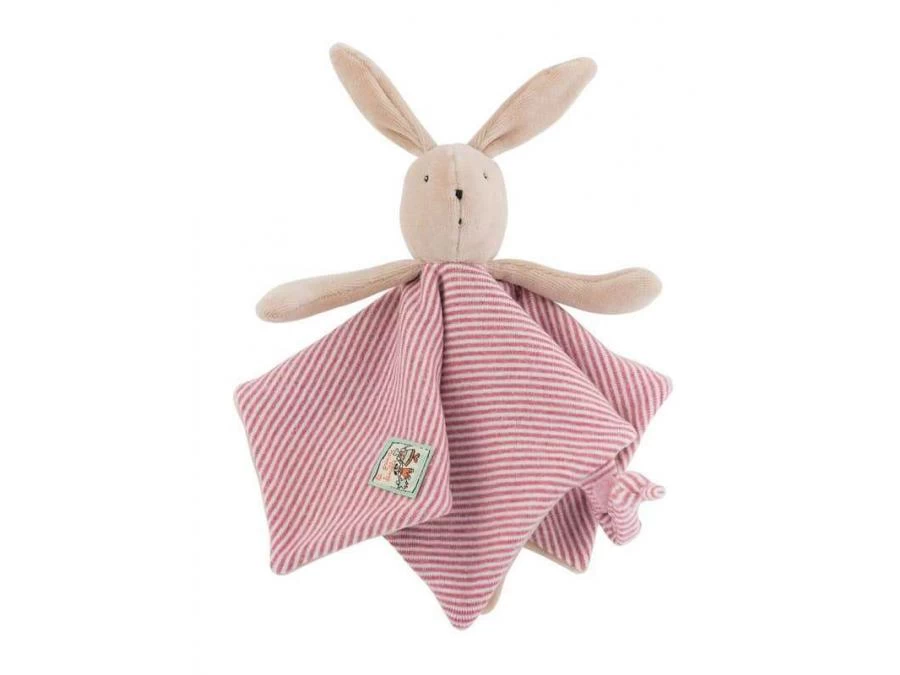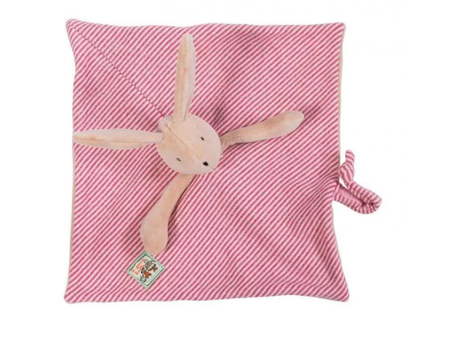 Petit lapin Sylvain, dans sa combinaison en jersey rayé pilou doublée velours pour ce doudou plat, facile à saisir par les petites mains de bébé. Il comprend un lien attache tétine. Peut être brodé au prénom de l’enfant. Idéal pour un cadeau de naissance.