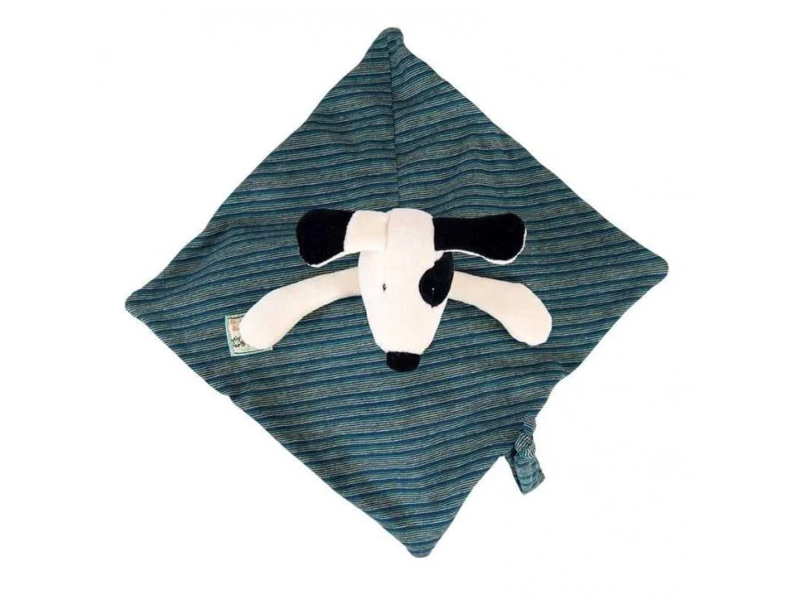 Petit Julius le chien, dans sa combinaison en jersey rayé bleu, vert et jaune pilou doublée velours pour ce doudou plat, facile à saisir par les petites mains de bébé. Peut être brodé au prénom de l’enfant. Idéal pour un cadeau naissance.