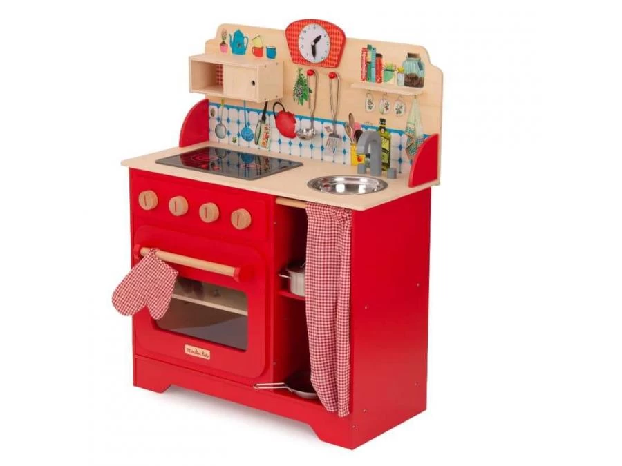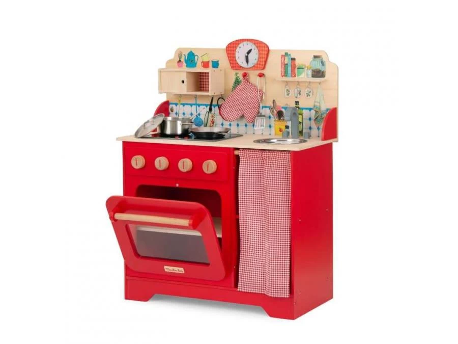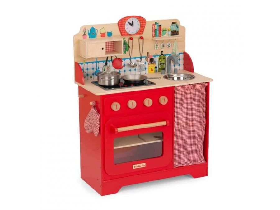 Chouette, une journée aux fourneaux avec la Grande Famille ! Cette cuisinière illustrée en bois comprend tous les accessoires pour préparer de bons petits plats : des ustensiles en métal, une manique vichy, et une plaque de cuisson sonore et lumineuse.