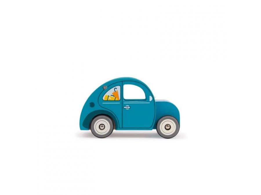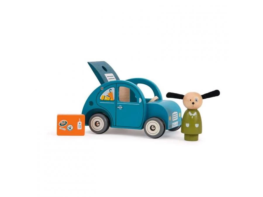 Julius part en week-end au volant de sa belle voiture décapotable ! Elle est en bois sérigraphié avec un coffre ouvrable pour y ranger sa valise. La voiture week-end peut être associée à la caravane de la même collection !