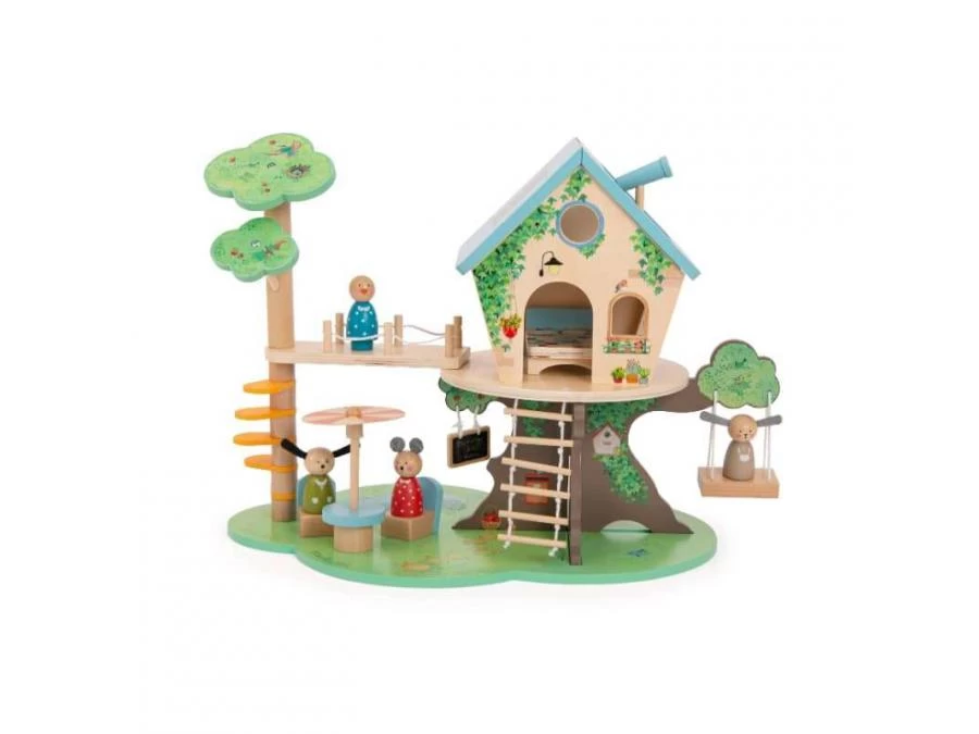 La cabane dans les arbres est l’endroit rêvé pour jouer ! On y accède grâce à l’échelle de corde ou par un pont suspendu à l’arbre voisin. Tout en bois et démontable, elle comprend même un petit salon de jardin pour se reposer à l’ombre…