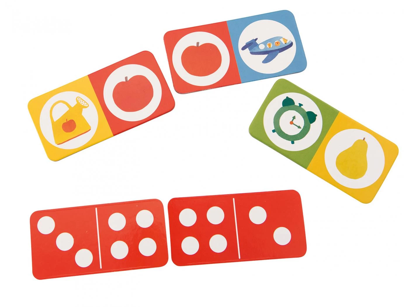 Jeu d’éveil en carton avec sur une face, les illustrations d’objets des Popipop en imagier, et sur l’autre face un jeu de dominos avec de gros poids blancs sur fond rouge. Un jeu pour observer et apprendre les chiffres, les couleurs et les formes.