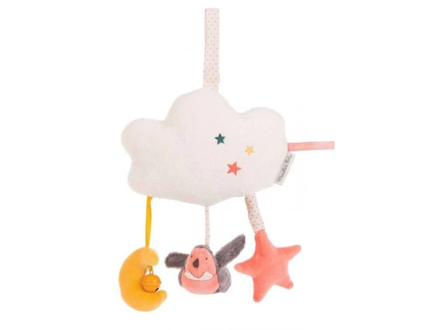 Pour jouer ou décorer, à suspendre partout, ce nuage d’activités en fourrure toute douce accompagne bébé tout au long de la journée : une lune grelot et un oiseau pouët pour s’amuser, ou une étoile à tirer pour s’endormir sur une douce mélodie…