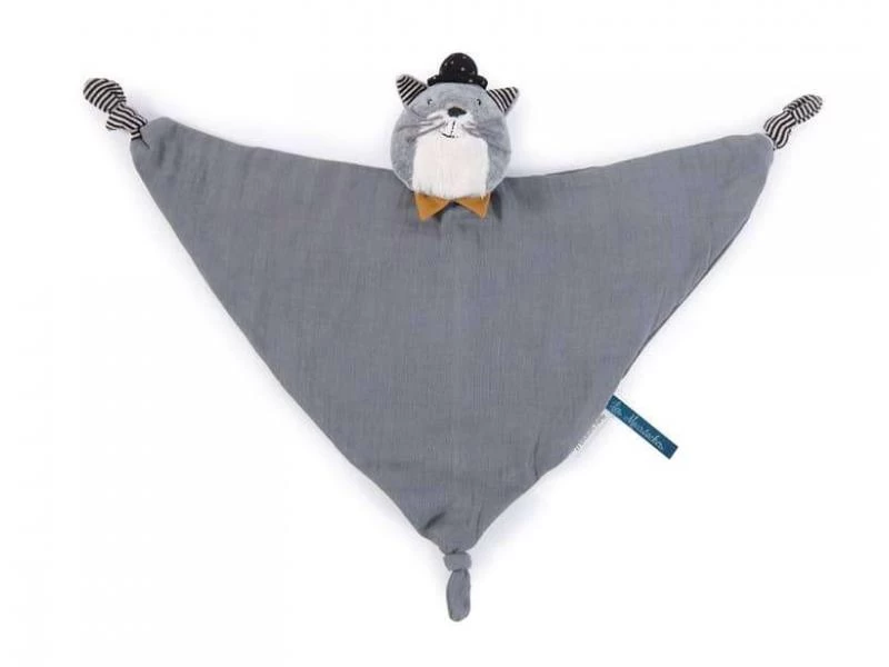 Doudou Fernand le chat en tissu lange gris clair, coiffé de son incontournable chapeau ! Noué à chaque coin, ce doudou plat est facile à saisir par les petites mains de bébé. Il peut être brodé au prénom de l’enfant. Idéal pour un cadeau naissance.