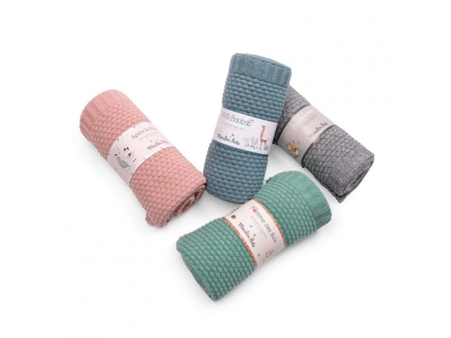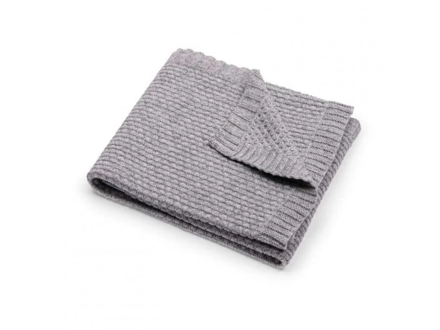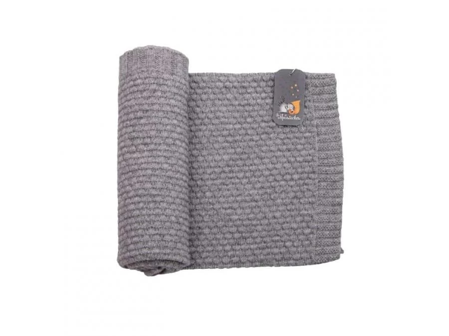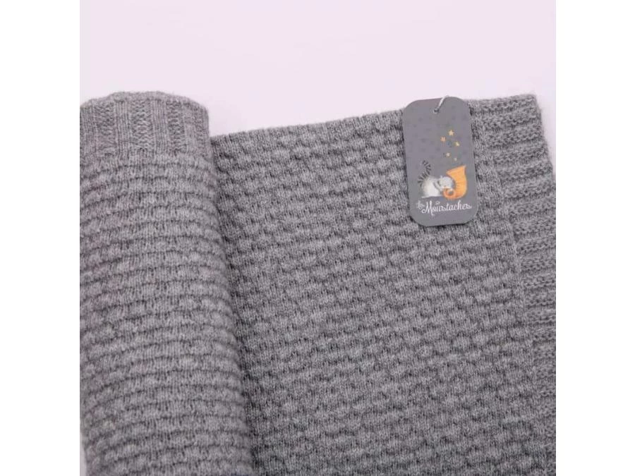 Couverture en tricot grise certifiée OEKO-TEX® qui aide les petits à réguler leur température corporelle grâce aux matières utilisées : 25% coton, 25% viscose, 25% polyamide, 22% laine mérinos et 3% cachemire.