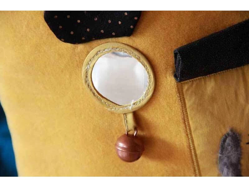Grelot cuivre, miroir avec biais jaune, plastique qui fait du bruit dans les nœuds : tout un tas d’activités pour amuser bébé dans un coussin en forme de maison.
