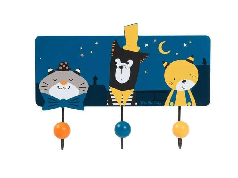 Porte-manteau en bois aux illustrations colorées, avec nos trois chats dandys sur fond de nuit étoilée… Il comprend trois patères rondes aux couleurs de la gamme. Fixations murales en métal.