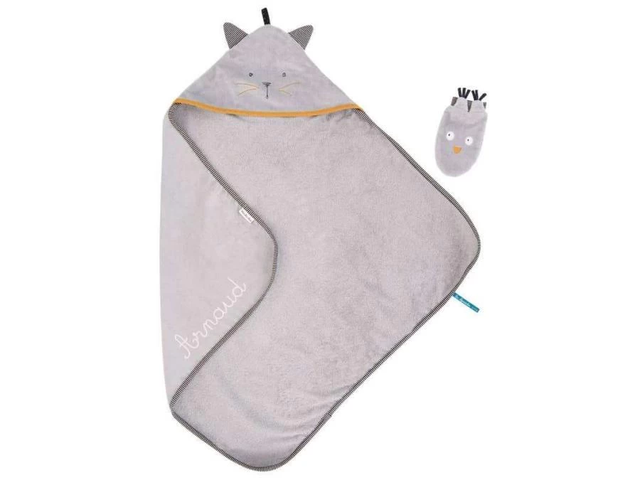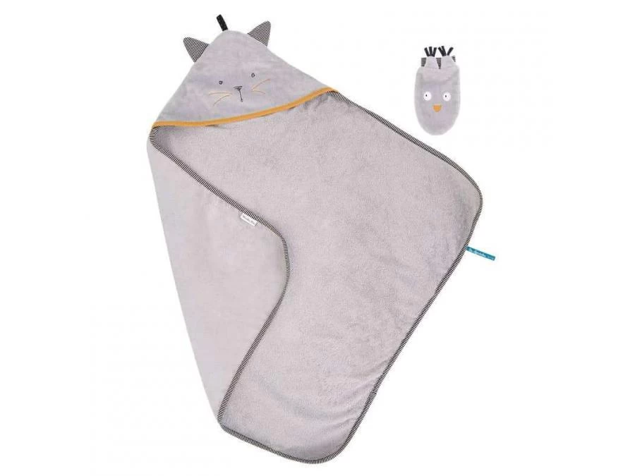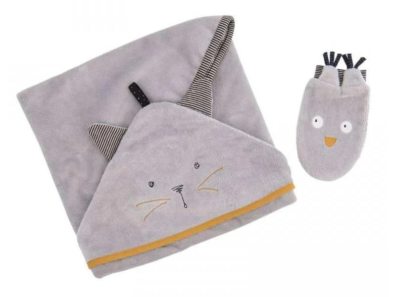 Pour envelopper bébé de douceur : gant petit hibou et sortie de bain tout en velours éponge gris avec capuche de lutin et petites oreilles de chat.
