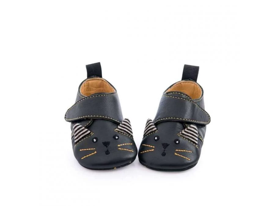 Chaussons en cuir 12/18m avec fermeture à scratch, brodés d’une tête de chat avec ses oreilles rayées. Ils sont doublés, souples, avec une semelle en cuir velours antidérapante et une semelle intérieure amovible avec mousse, pour le confort de bébé !
