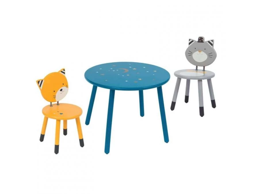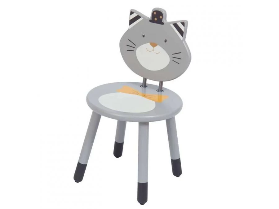 Chaise gris clair en bois avec dossier Fernand le chat toujours coiffé de son chapeau melon ! Idéale pour accompagner la table Les Moustaches, elle servira aussi bien dans la chambre qu’au salon !