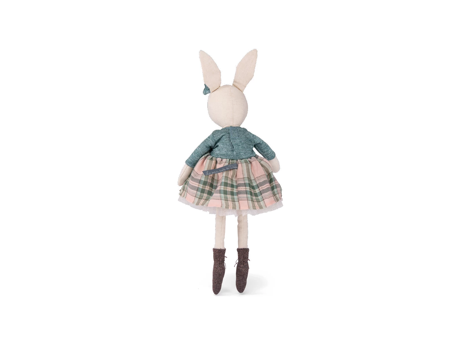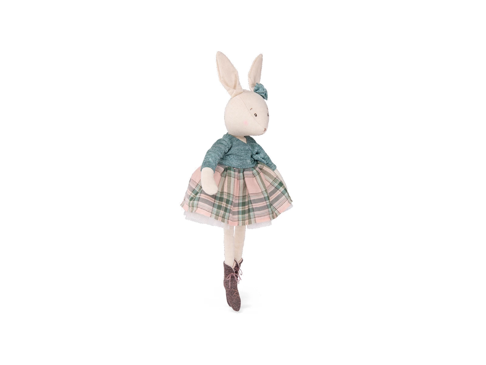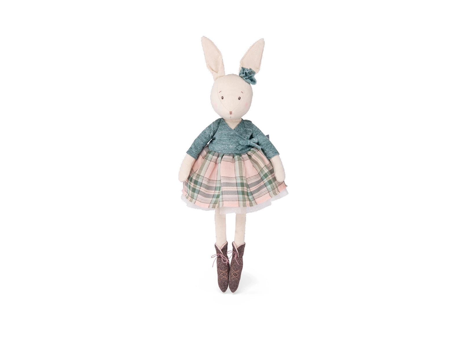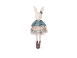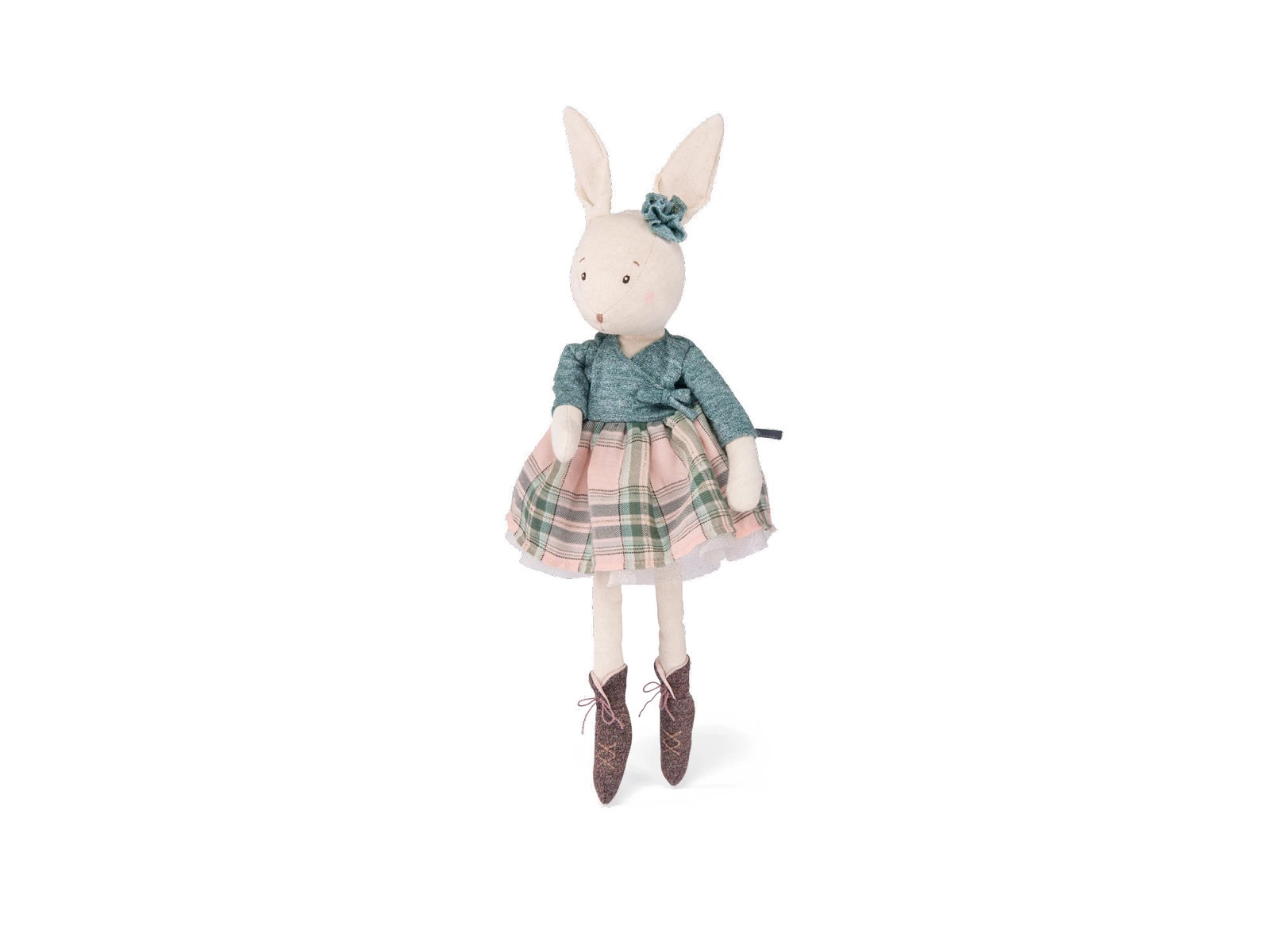 Poupée lapin en chambray au doux visage brodé, Victorine, d’une grande élégance est vêtue de sa robe à carreaux et de son tulle pailleté. Facile à attraper par les petites mains, elle deviendra le compagnon de jeu privilégiédes petits danseurs en herbe.
