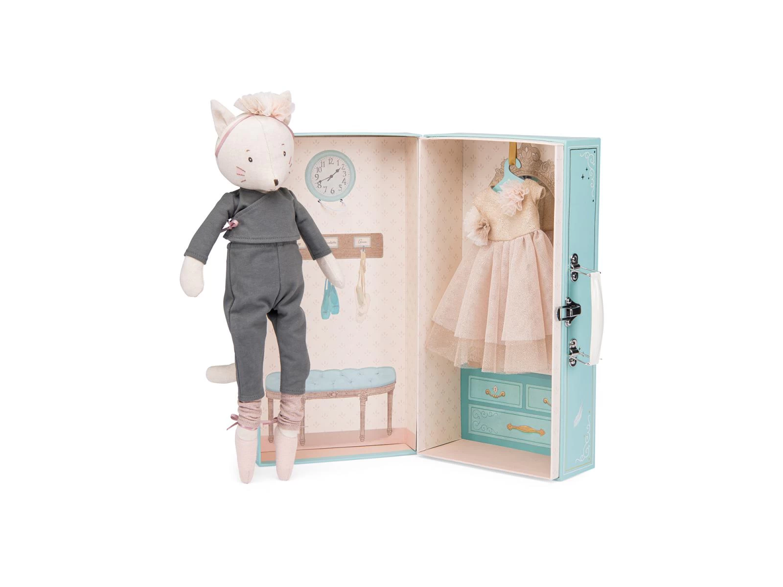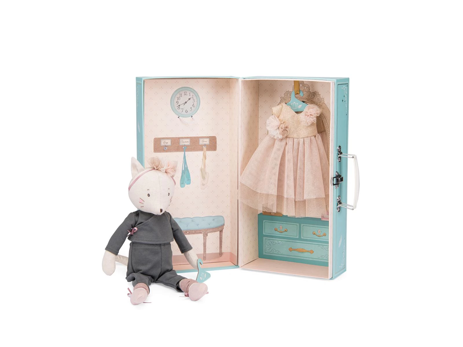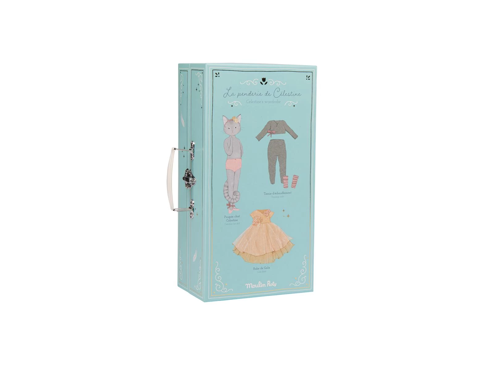 Célestine la poupée chat nous invite dans sa penderie. Une valise armoire avec miroir intégré qui comprend tenue d’échauffement et robe de gala sur cintre. Petits pas, pas de deux, pas de chats… il faut s’entraîner avant le spectacle de fin d’année.