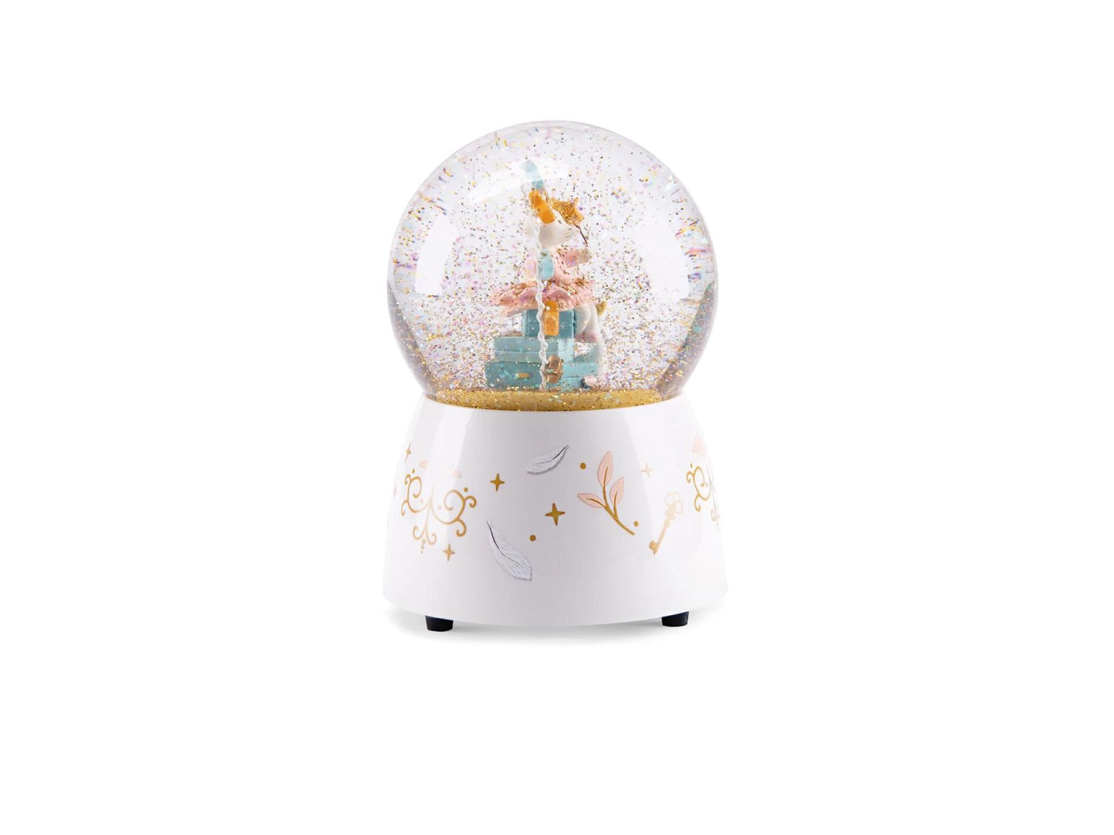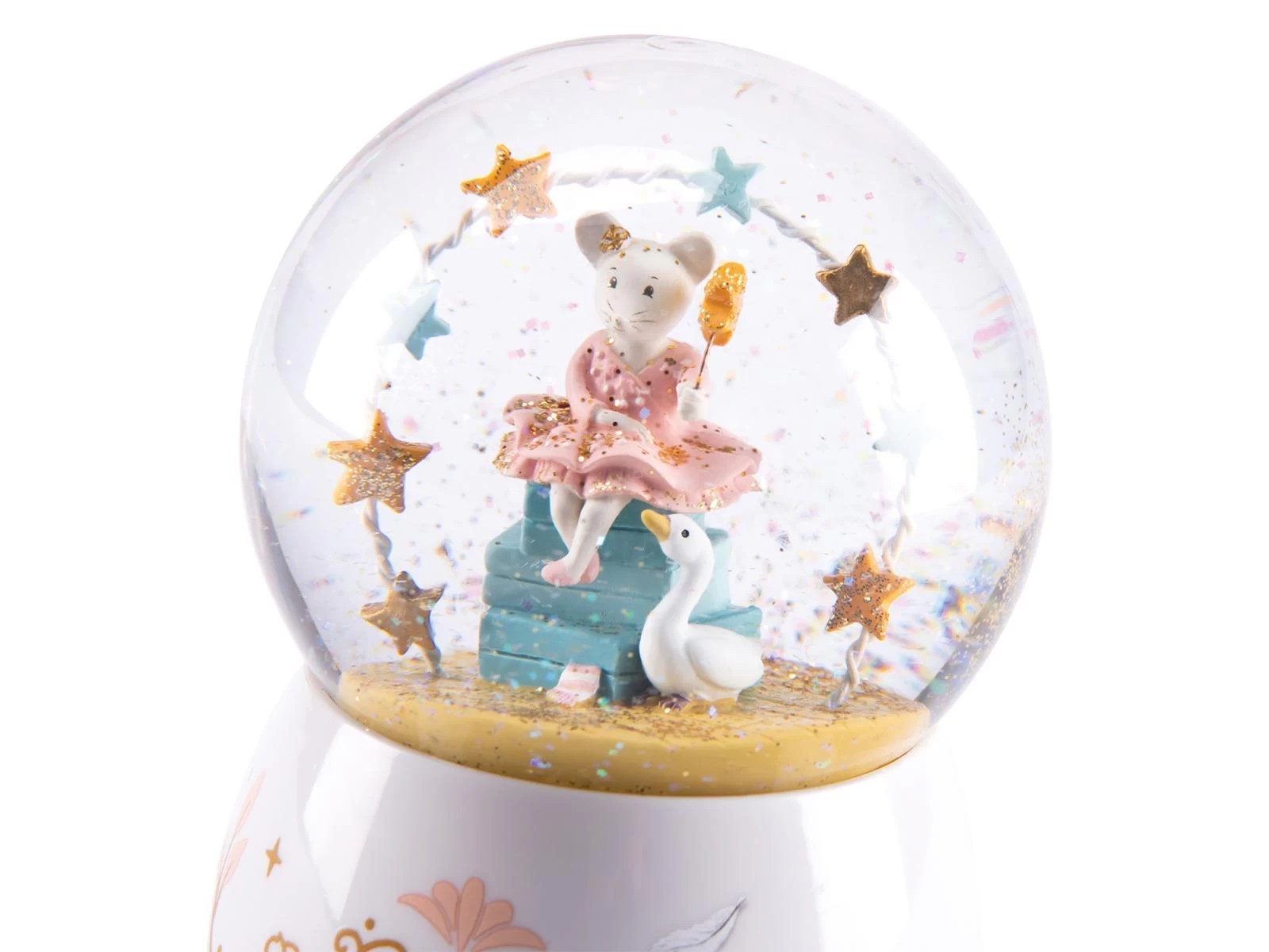 Boule à neige musicale avec la petite souris et son oie qui font la fête au milieu des paillettes holographiques ! En plus de décorer la chambre, une jolie mélodie viendra bercer bébé au moment du coucher… (voir 669241)