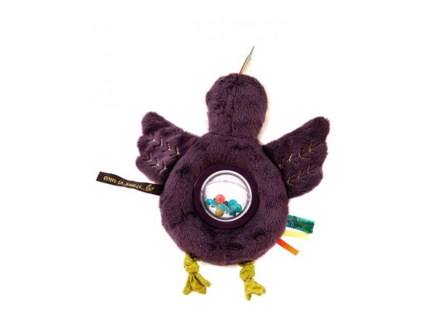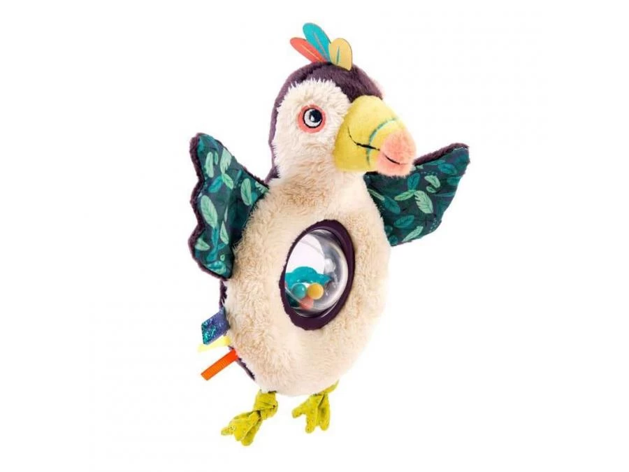 Petit hochet toucan vivement coloré et agrémenté de motifs tropicaux, avec dans son ventre en plastique transparent, des petites billes colorées. L’intérieur de ses ailes renferme du plastique qui fait du bruit quand on les agite…