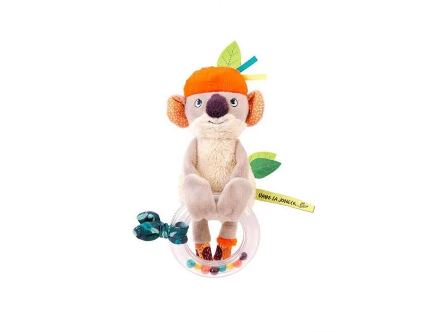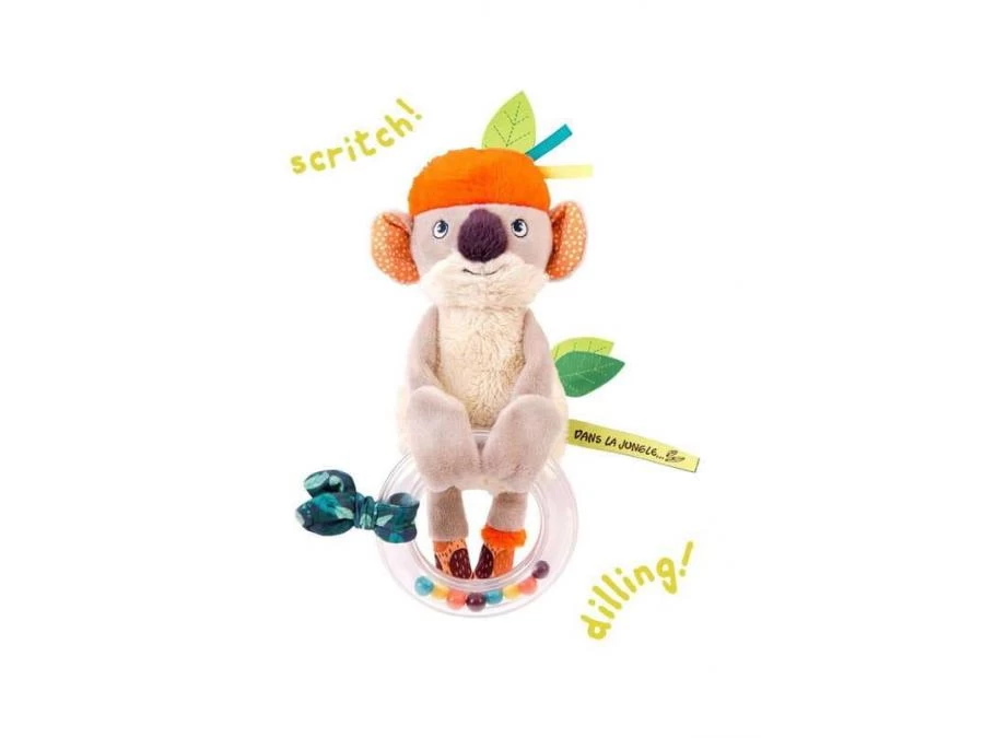 Hochet anneau billes. Que fait le koala dans les arbres ? Il se suspend ! Accrochez-le où vous voulez grâce à une attache sur sa main. Sur l’autre, un anneau à billes et du papier crissant dans ses oreilles pour éveiller l’intérêt de bébé.
