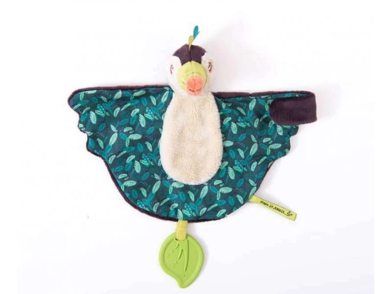 Ce doudou toucan crème et noir aux touches de couleurs vives, déploie ses grandes ailes aux motifs feuilles pour envelopper bébé de douceur et de tendresse. Comporte une attache-tétine et une spatule dentaire bleue.