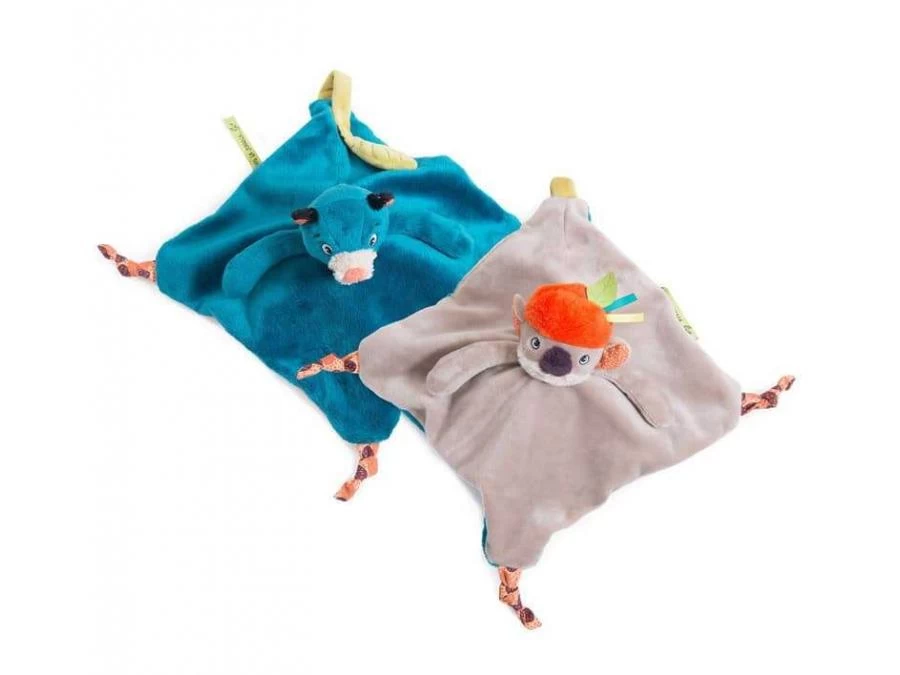 Doudou plat cache-cache tout doux. Tendre koala marron d’un côté, douce panthère bleue de l’autre… pour deux fois plus de tendresse ! Comporte une attache-tétine, un anneau de dentition, et des petits rubans et nouettes aux quatre coins.