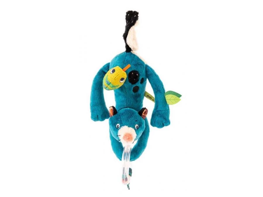 La petite panthère d’activités amuse la galerie ! Suspendu par la queue, elle tient dans ses pattes un anneau à billes qui fait du bruit. Un parfait petit équilibriste joliment accessoirisé par des gris-gris colorés.