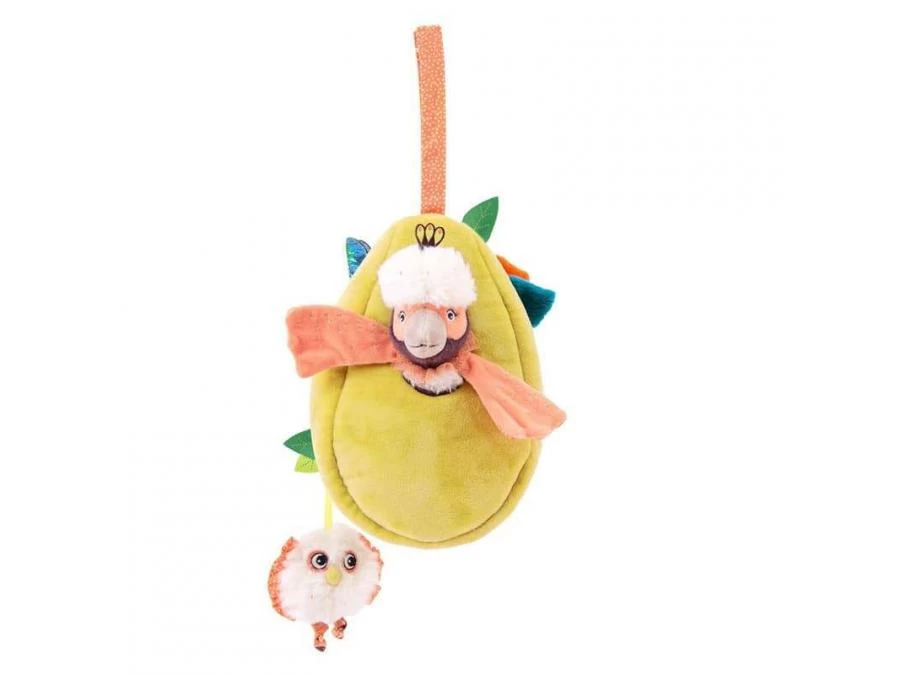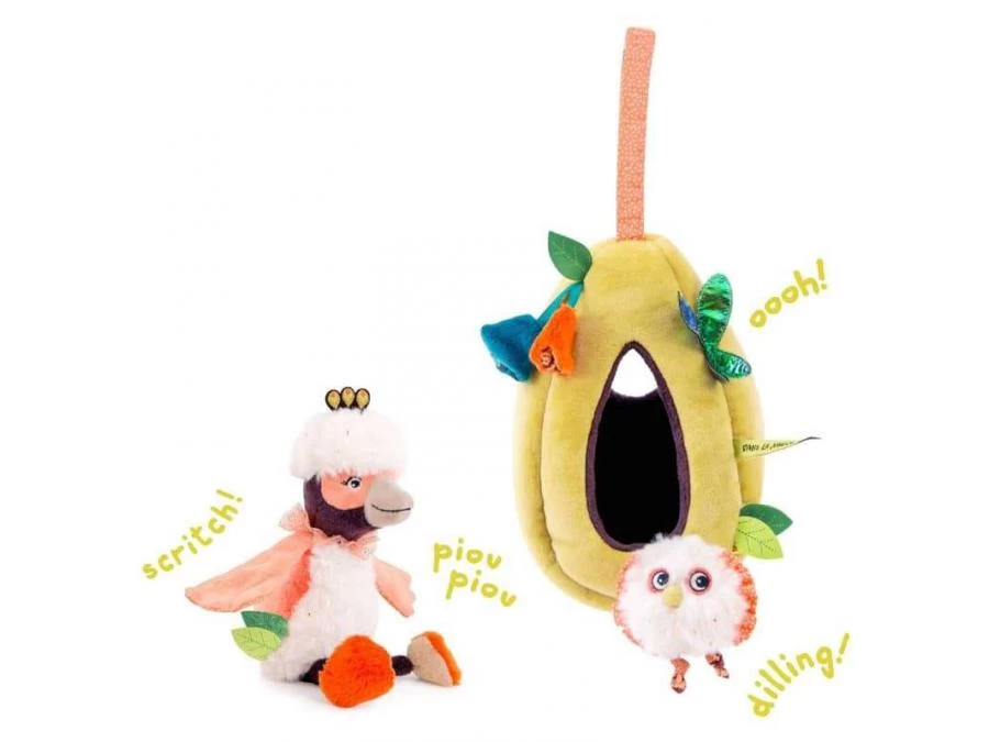 La nuit tombée, l’oiseau rentre dans son nid-cabane qui se suspend par deux liens. On y trouve des accessoires pour éveiller l’intérêt de bébé, du papier crissant dans ses ailes et un joli bruit d’oiseau quand on appuie sur son ventre.
