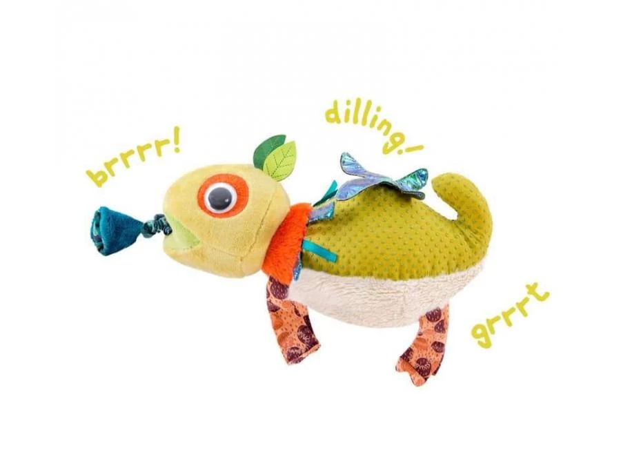 Il est fou ce caméléon ! Tirez sur la fleur-grelot qu’il tient dans sa bouche et son corps se mettra à vibrer ! Ses yeux mobiles bougent dans tous les sens. Peut s’accrocher n’importe où grâce à une attache sur sa queue.