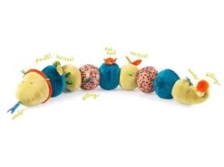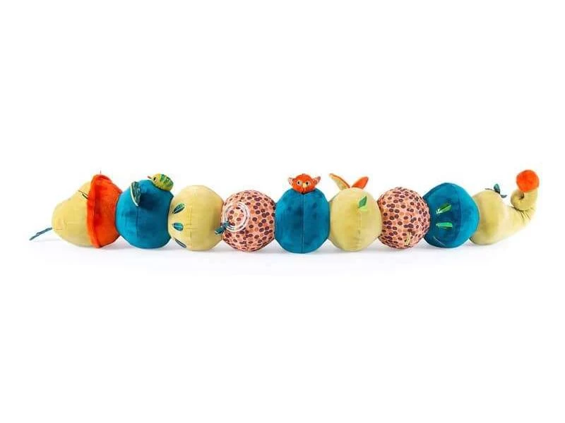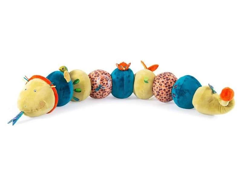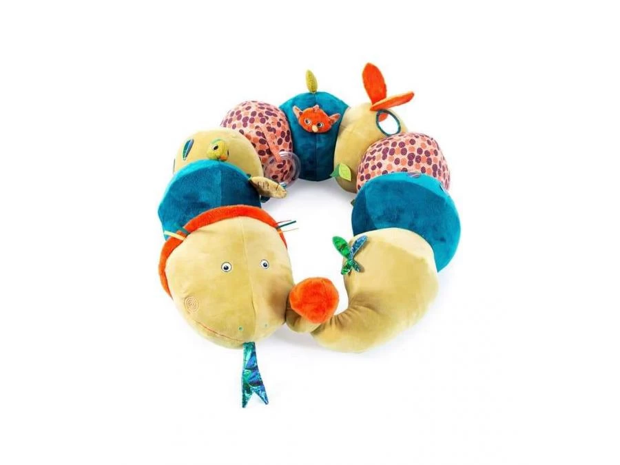 Oh la la, mais qui voilà… Un serpent d’activités de plus de 2 mètres ! Coloré, à motifs… il ne passe pas inaperçu ! Sur lui se trouve des fleurs-grelots, un petit poussin suspendu, un hochet anneau billes, un caméléon, un papillon…
