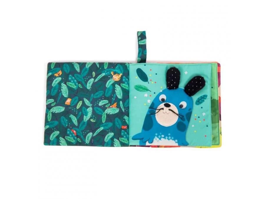Jeux de matières pour ce livre en tissu 6 pages, avec sa lanière à scratch pour le transporter. On découvre les personnages de la jungle avec leurs accessoires en relief pour éveiller la curiosité des tout-petits, et les entraîner à la manipulation.