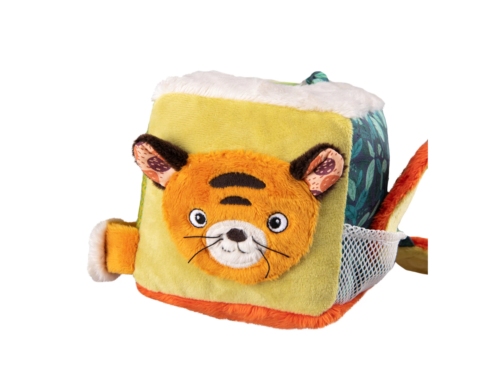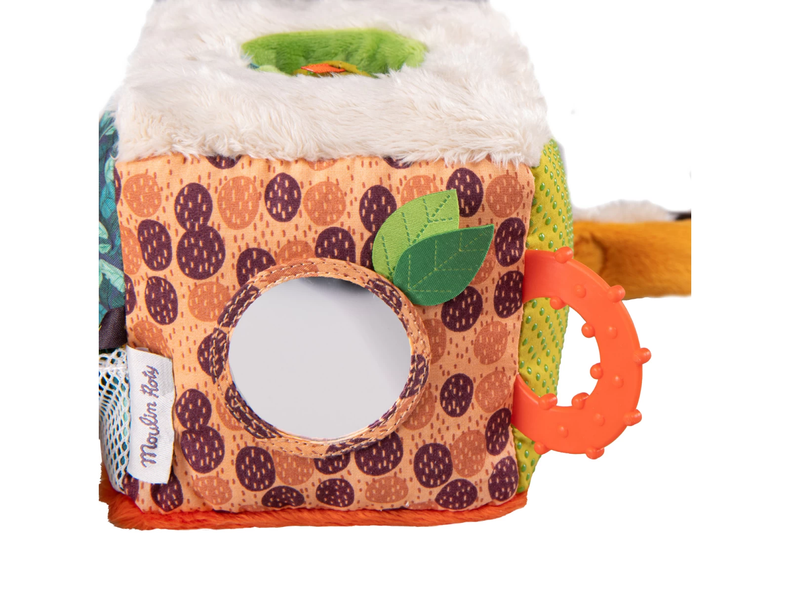 A chaque face son activité pour ce cube en tissu aux couleurs de la jungle. Feuilles qui crissent, étiquettes à attraper, anneau de dentition à mordiller, petit caméléon caché… bébé a de quoi s’amuser ! Peut-être suspendu grâce à son attache-velcro