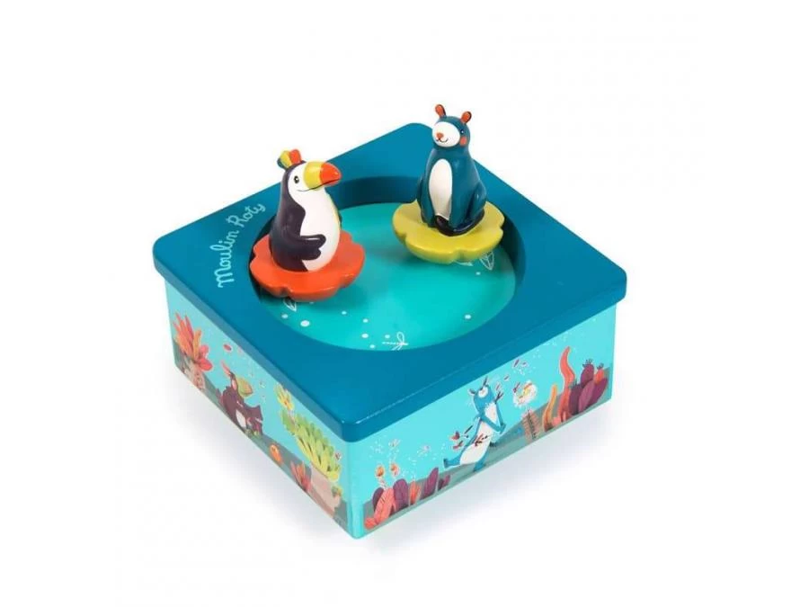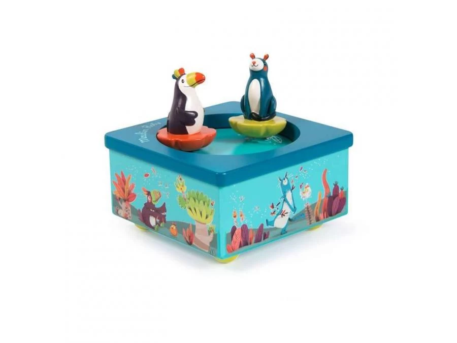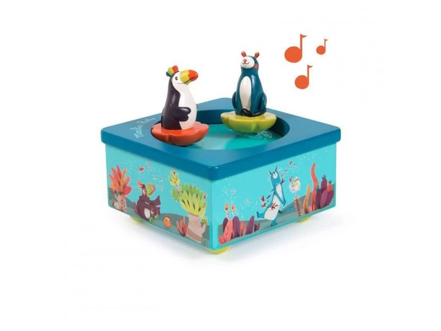 Boîte à musique illustrée d’un joyeux paysage de la jungle, fait de couleurs vives et de personnages chantants ! Pakou le toucan et Zimba la panthère tournent et dansent sur la piste pour bercer et endormir bébé.