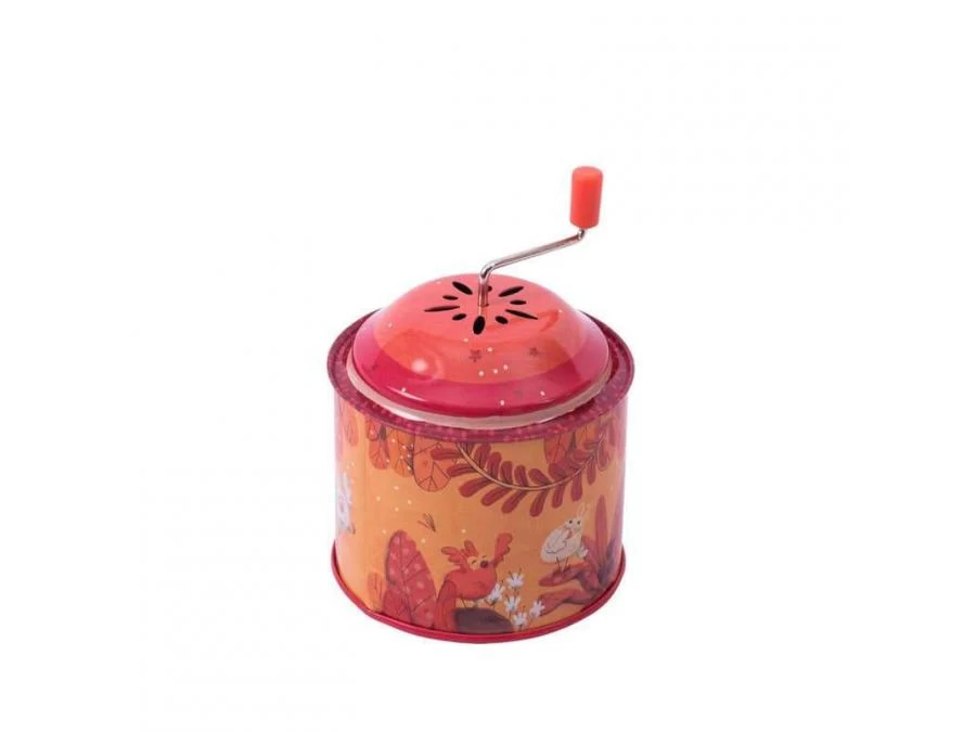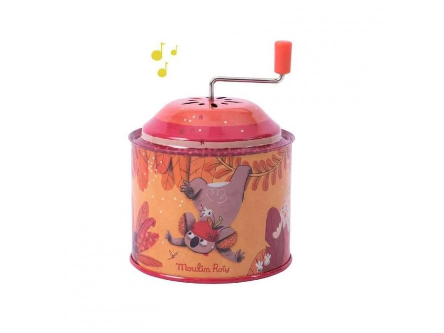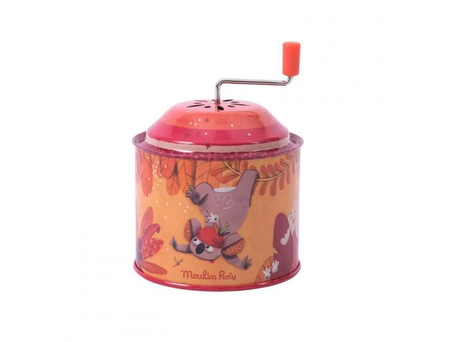 Tourne, tourne et en avant la musique ! Clin d’œil aux jouets qui ont accompagné notre enfance, le moulin à musique en métal coloré de Dans la jungle met en scène Koco le koala dansant de lianes en lianes.