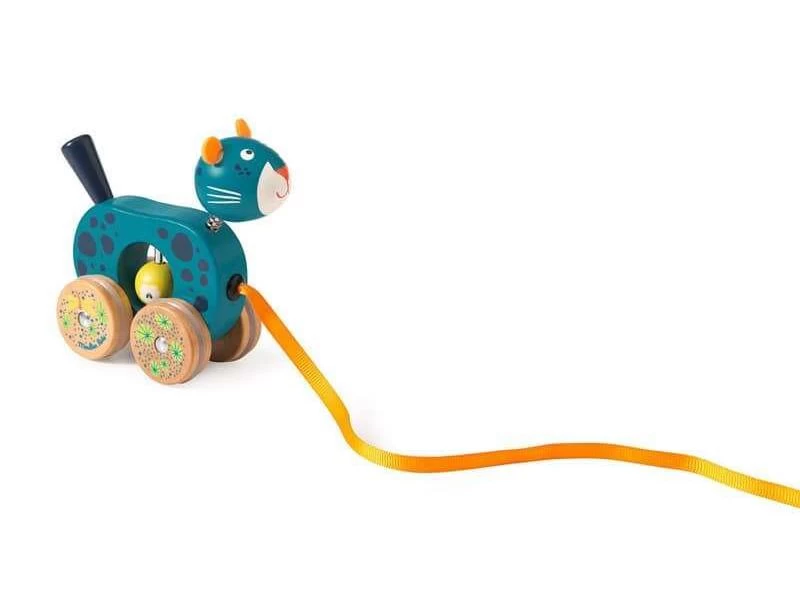 Petite panthère à tirer en bois coloré et illustrations imprimées. Dans son ventre, un grelot fait du bruit, et sa tête fixée sur ressort s’agite quand la panthère avance ! Jouet à tirer par un ruban. Développe la motricité de l’enfant.