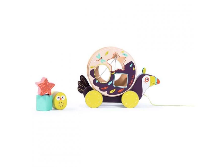 Toucan boîte à formes à tirer en bois très coloré et illustré. Comporte trois formes géométriques à encastrer et un grelot qui fait du bruit quand la roue tourne. Développe la motricité de l’enfant et lui apprend les formes et les couleurs.