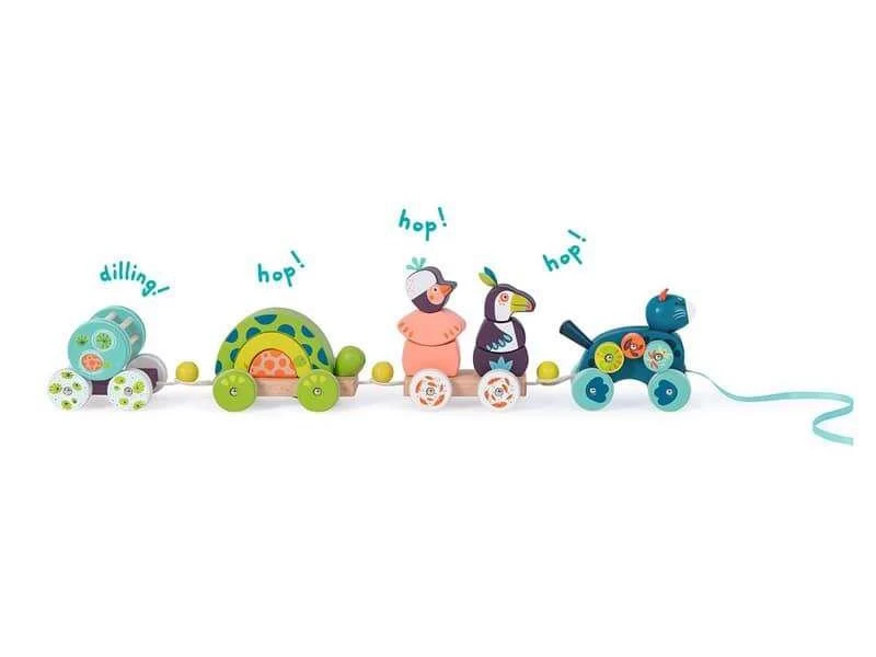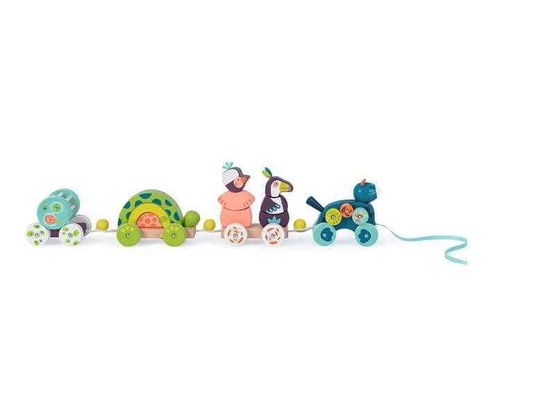 Le train est prêt à partir… en avant ! Grand train d’activités en bois, composé de différents wagons rigolos : la panthère bleue et ses roulettes, le toucan, l’oiseau et la tortue empilables, et la boîte hochet à boule et grelot. Train à tirer.
