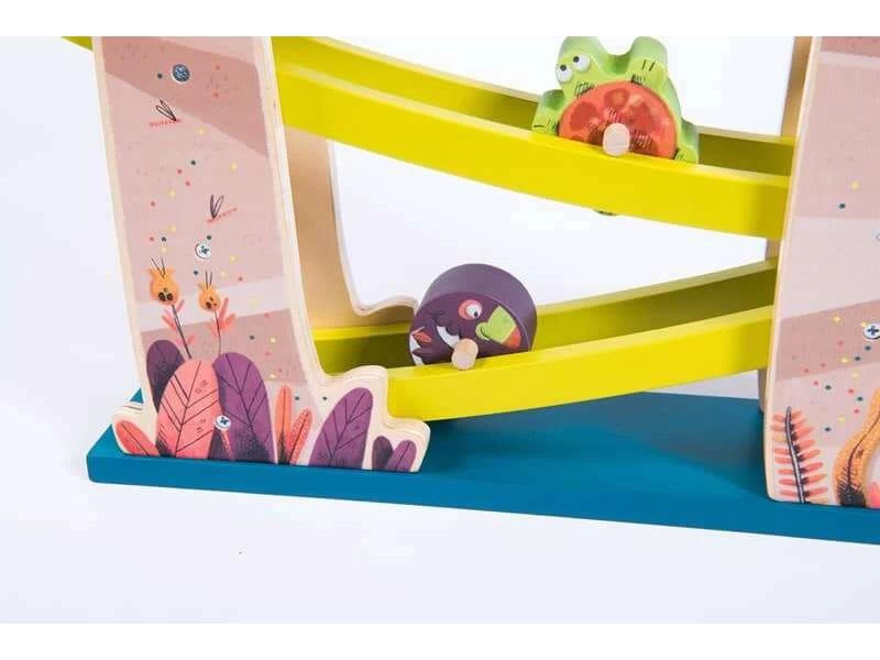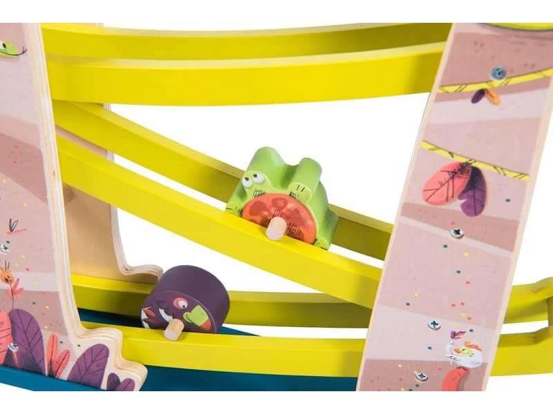 Les toupies dévalent les pentes de la jungle ! Cette cascade est composée de passerelles inclinées reliant deux baobabs en bois, où se laissent rouler les toupies toucan, serpent, et tortue. Leur terrain de jeu préféré !