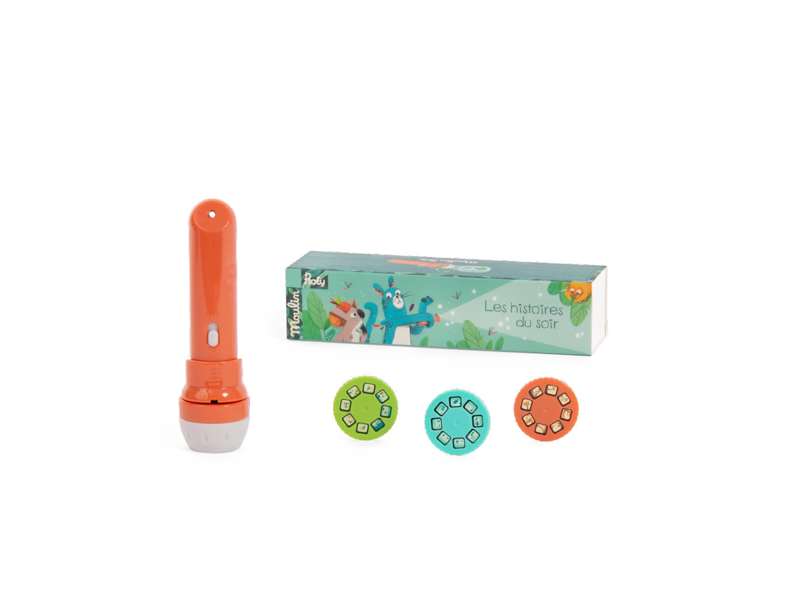 Lampe torche de poche où chacun des 3 disques projetés sur le mur raconte une histoire. Elles racontent les aventures joyeuses et colorées des amis de la Jungle. Un instant magique pour développer l’imagination des enfants…
