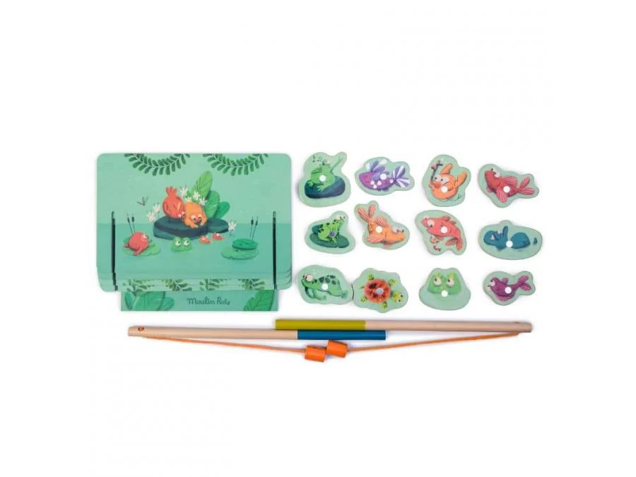 Jeu de pêche à la ligne comprenant un décor en carton illustré à monter, 2 cannes à pêche en bois et 12 pièces aimantées, numérotées. Le but du jeu est de récolter un maximum d’éléments rapportant chacun, un certain nombre de points.