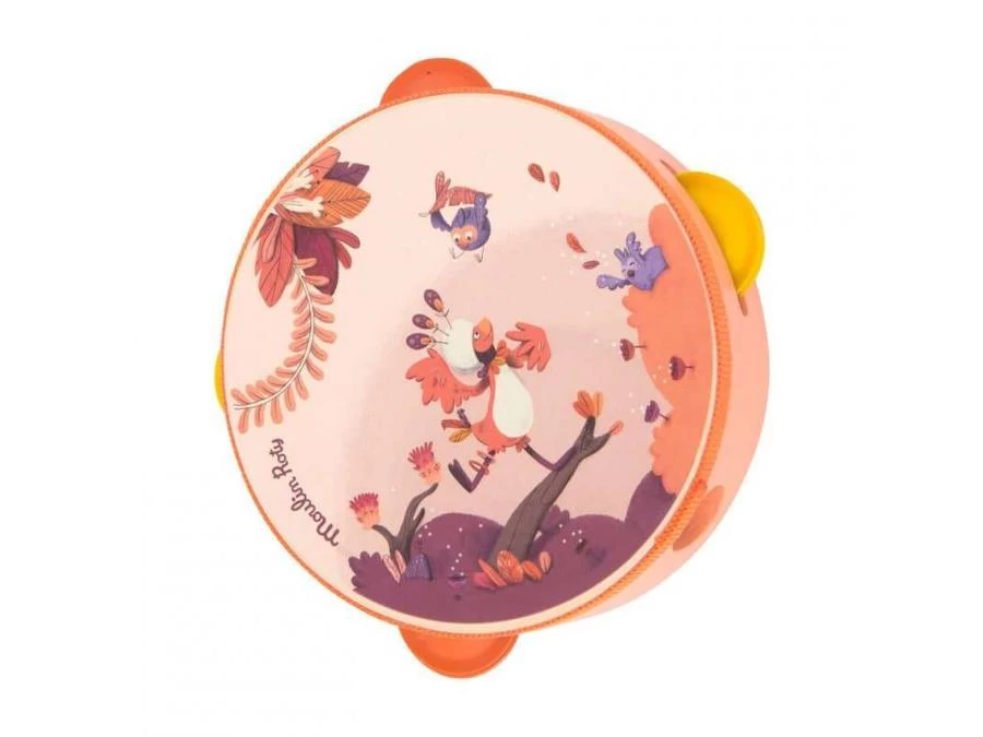 Tambourin en bois avec 4 cymbales, peint en rose corail avec ruban sur la tranche et illustrations de Paloma l’oiseau dansant au cœur de la jungle. Développe le rythme et l’éveil musical des tout-petits, facile à utiliser.