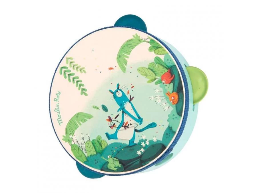 Tambourin en bois avec 4 cymbales, peint en vert d’eau avec ruban sur la tranche et illustrations de Zimba la panthère dansant au cœur de la jungle. Développe le rythme et l’éveil musical des tout-petits, facile à utiliser.