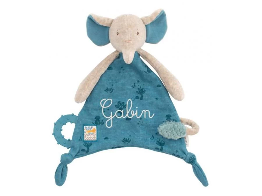 Doudou Bergamote l’éléphant et ses grandes oreilles toutes douces. Il comprend une queue à transformer en attache tétine à scratcher, et un anneau dentaire sur le côté. Le prénom de bébé pourra être brodé sur la combinaison de son nouveau compagnon.