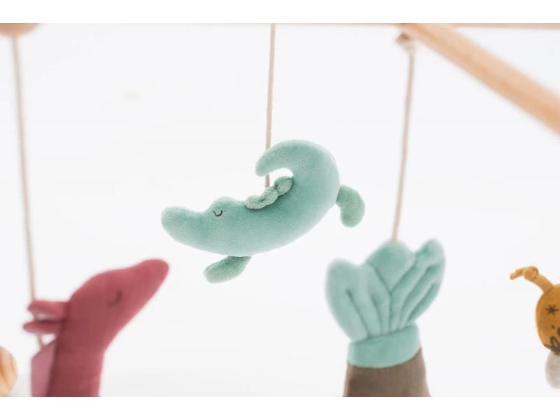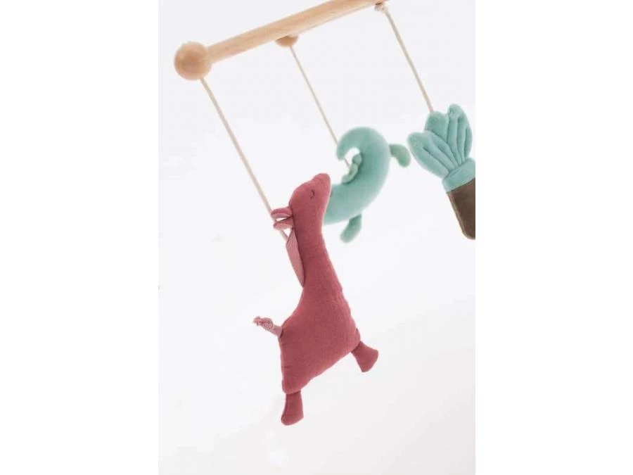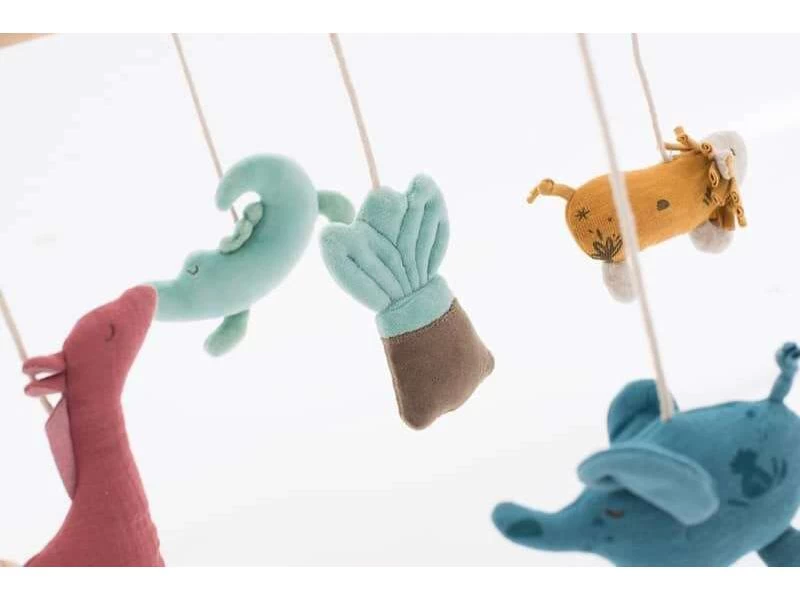 Mobile musical pour éveiller la vue et l’ouïe de bébé, avec une structure en bois et les 4 compagnons de la collection. La girafe, l’éléphant, le lion et le crocodile dansent sur une douce mélodie autour du baobab pour bercer bébé…