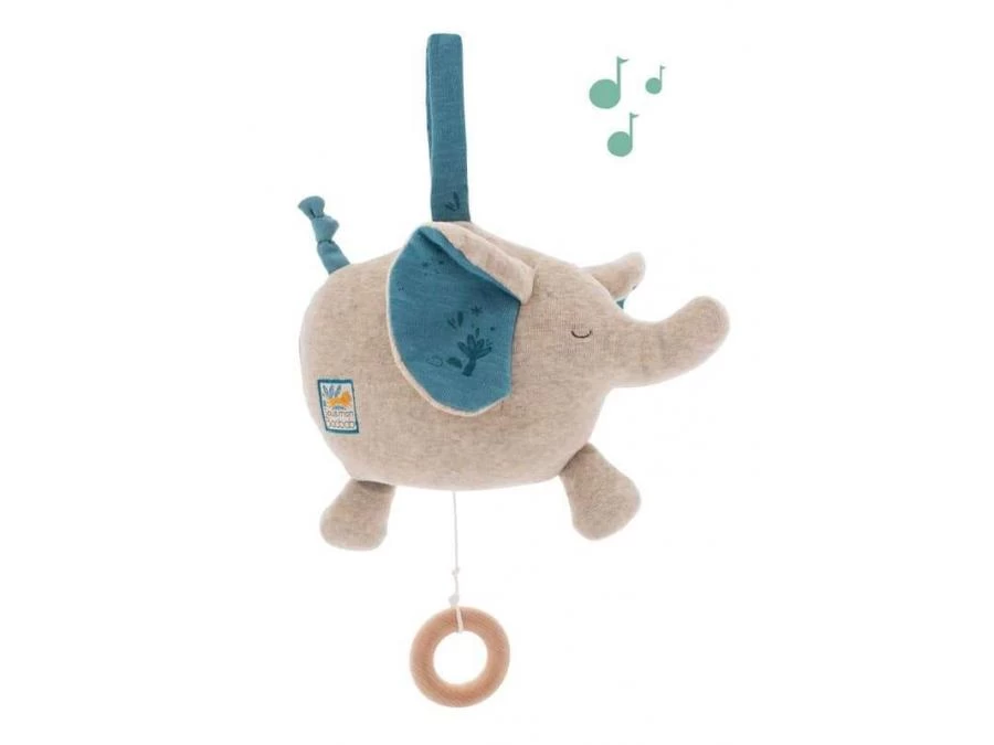 L’éléphant bercera bébé pour une douce nuit… Tirez sur l’anneau en bois sur son ventre et laissez-vous porter par le son doux et apaisant de la mélodie. Grace à sa languette à scratch, il se suspend pour accompagner bébé partout.