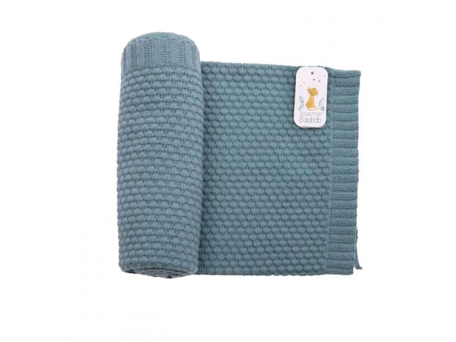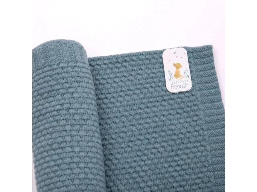 Couverture en tricot bleu certifiée OEKO-TEX® qui aide les petits à réguler leur température corporelle grâce aux matières utilisées : 25% coton, 25% viscose, 25% polyamide, 22% laine mérinos et 3% cachemire.