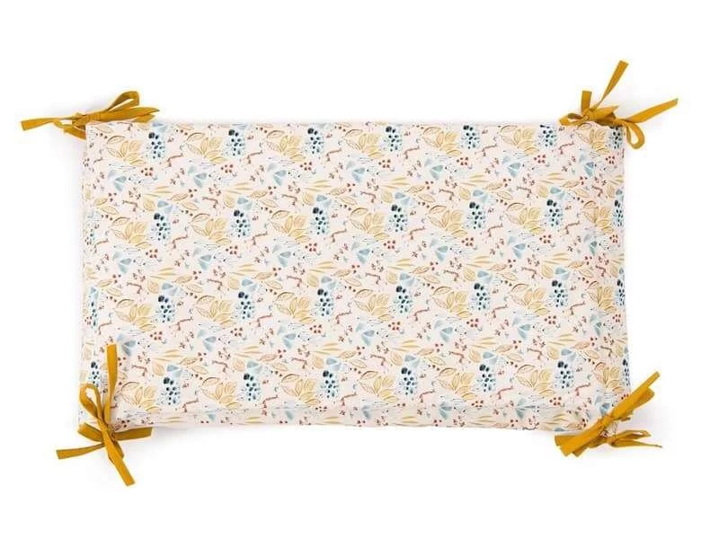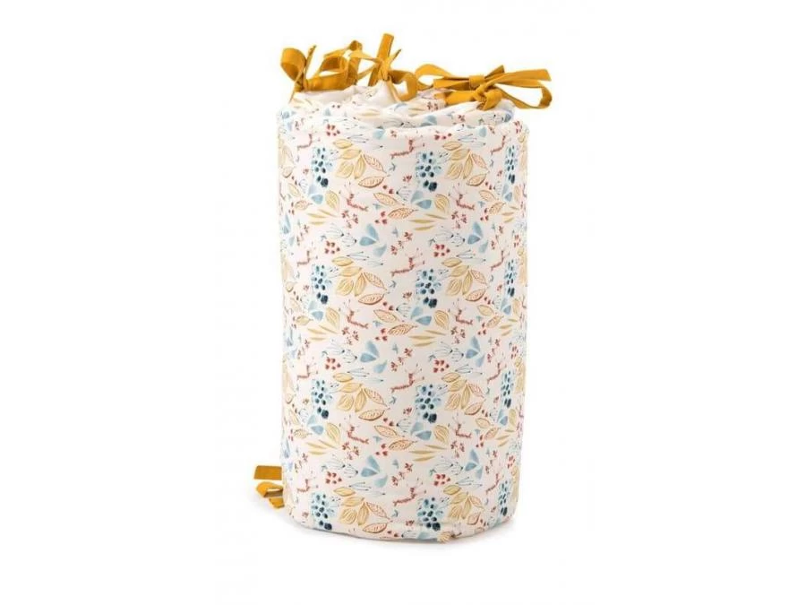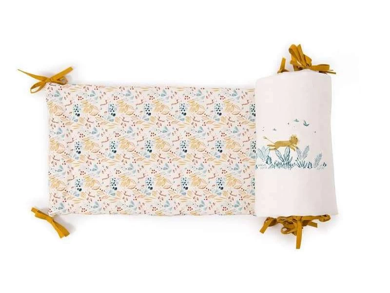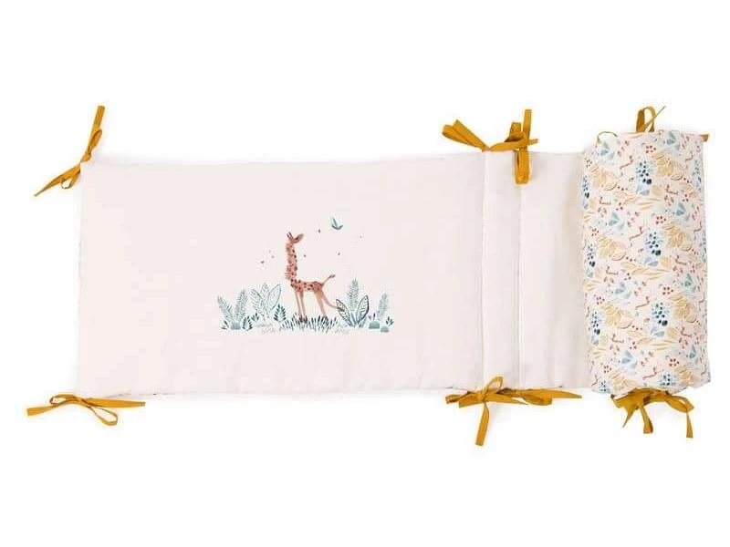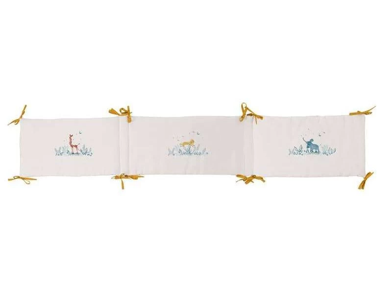 Tour de lit beige rembourré en lin lavé et coton très doux, avec liens jaune ocre, délicatement illustré des animaux de la collection : la girafe, l’éléphant et le lion. Il habillera le lit pour entourer bébé de douceur et décorer sa chambre.