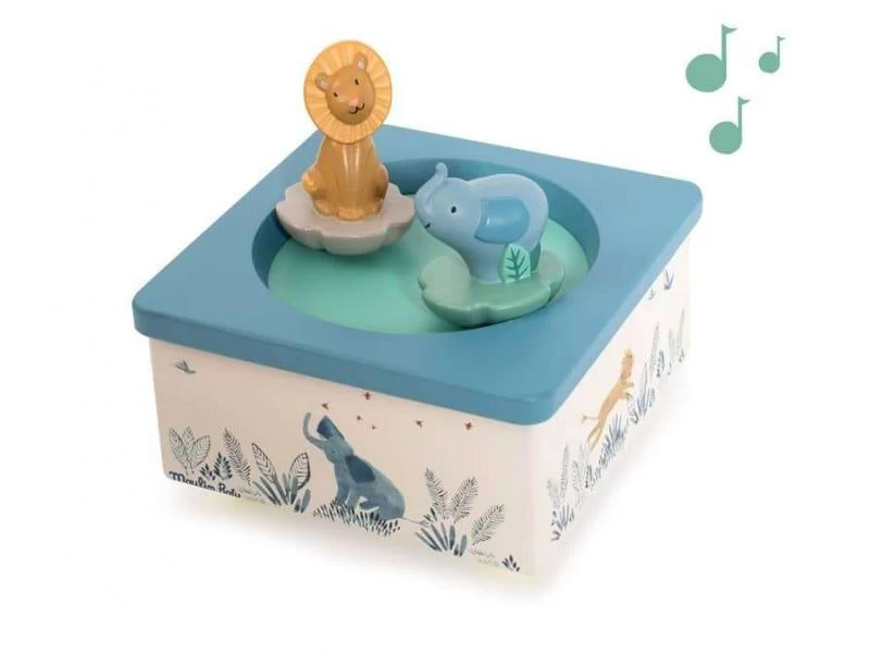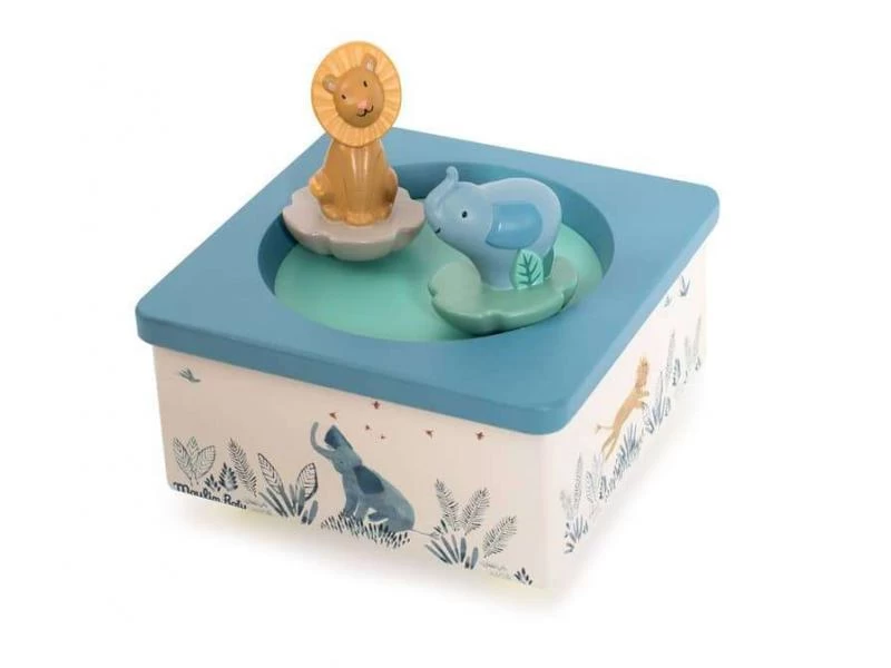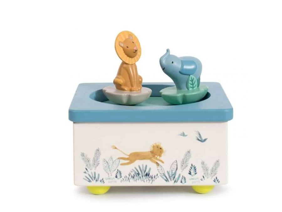 Boîte à musique couleur crème, reprenant les illustrations de l’éléphant et du lion au milieu de la savane. Les deux personnages tournent et dansent sur une jolie musique pour endormir bébé…