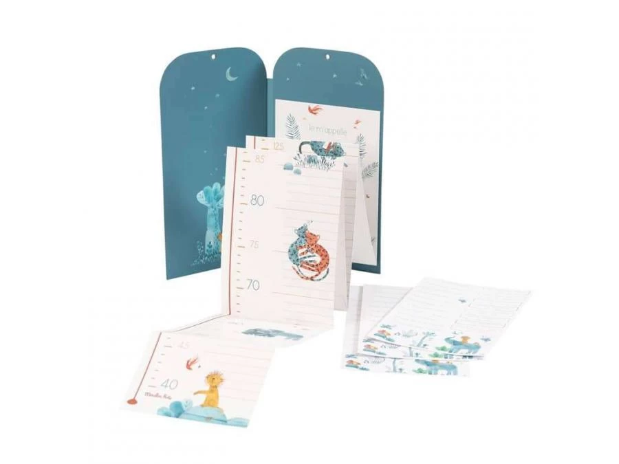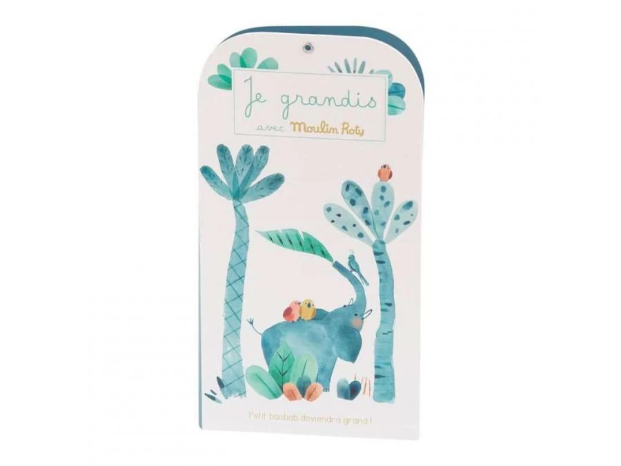 Toise en carton avec stickers déco aux couleurs et illustrations à l’aquarelle de la gamme Sous mon baobab. Présentée sous la forme d’un carnet, elle devient un ravissant accessoire déco une fois dépliée, pour y noter la taille de bébé et tout plein d’anecdotes !