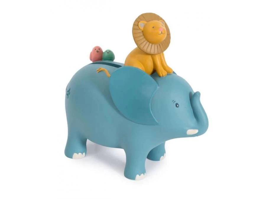 Tirelire en résine avec Paprika le lion et ses amis les oiseaux se baladant à dos d’éléphant… Elle apportera une jolie touche de décoration dans la chambre !