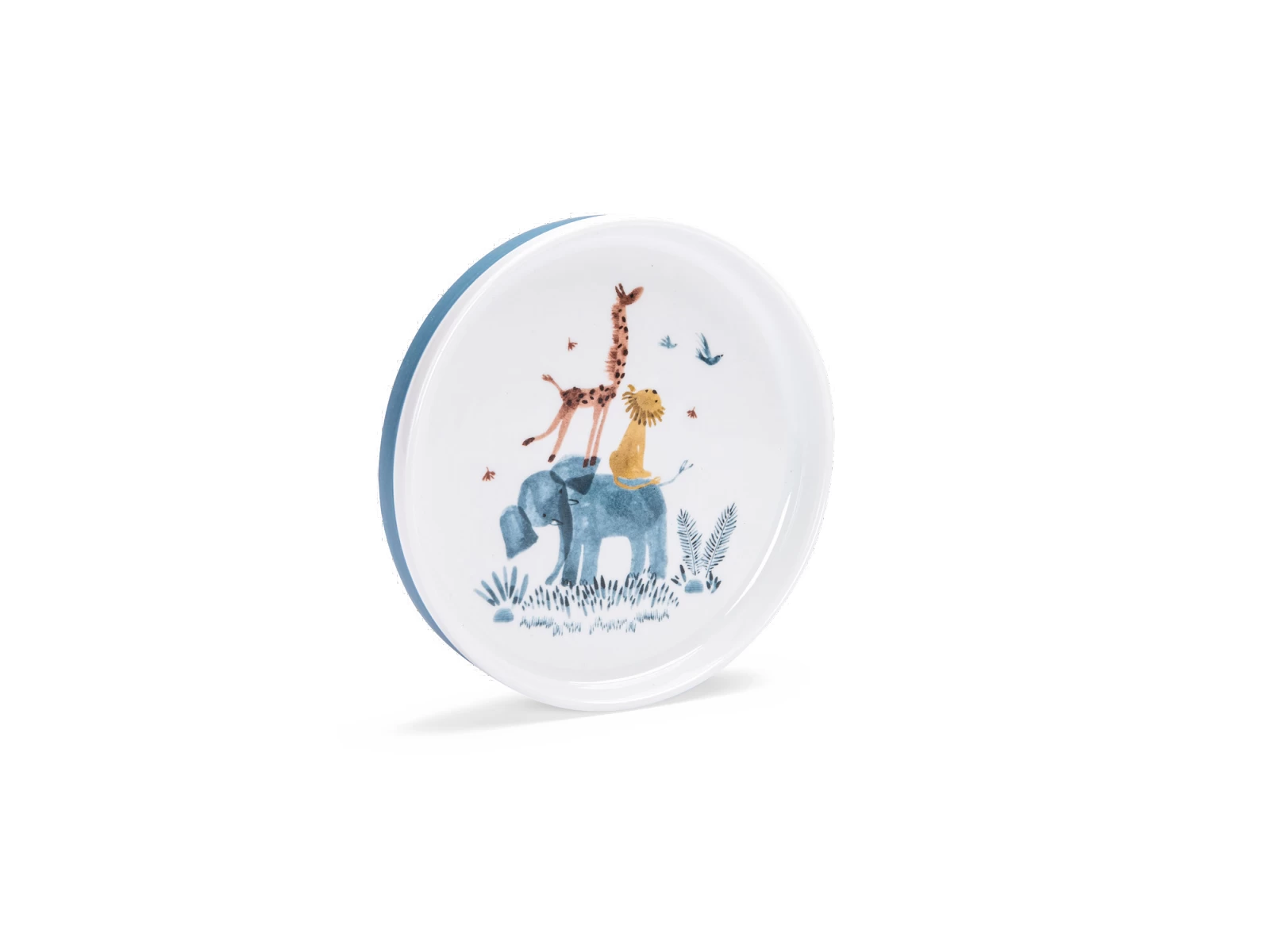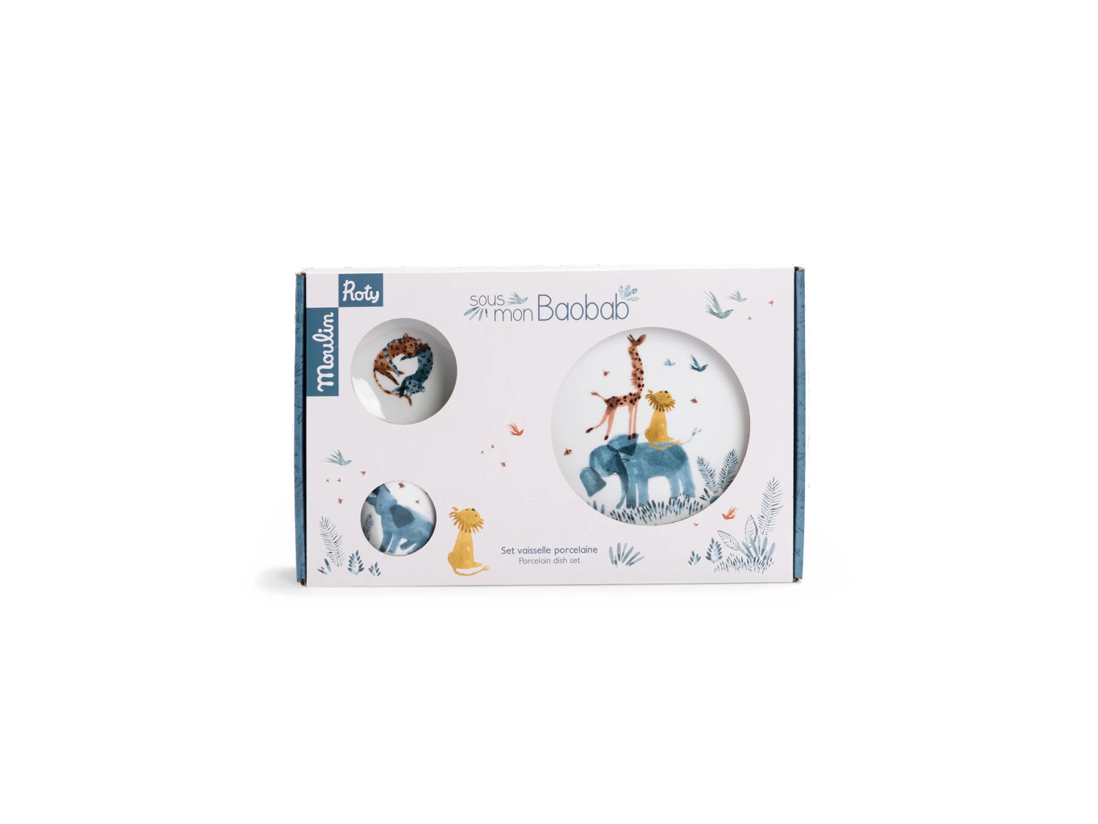 Coffret vaisselle en porcelaine, tendrement illustré pour manger comme les grands. Comprend bol, tasse à anses et assiette avec chaussette antidérapante en silicone amovible qui adhère sur les surfaces lisses et empêche de glisser ! Passe au lave-vaisselle.
