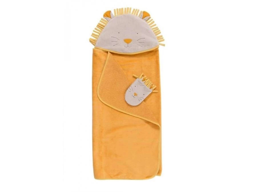 Cape de bain en éponge avec une capuche en tête de lion et sa drôle de crinière… que l’on retrouve aussi sur un petit gant brodé ! Idéale pour un cadeau de naissance, elle peut être brodée au prénom de l’enfant.