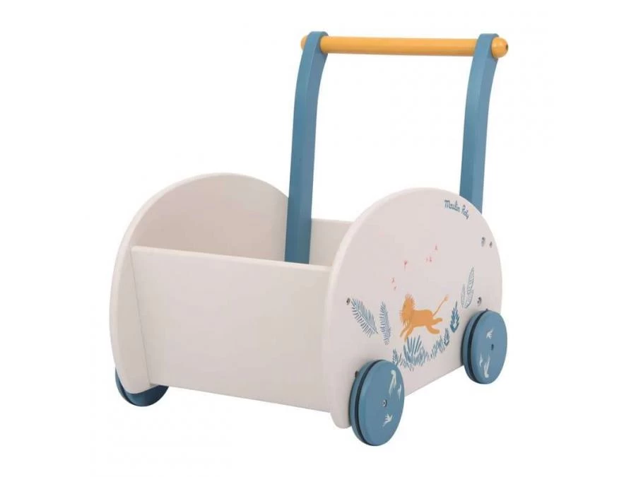 Pour accompagner l’enfant dans l’apprentissage de la marche et transporter tous ses jouets : chariot en bois peint, aux formes rondes, avec les illustrations à l’aquarelle de Paprika le lion foulant les herbes de la savane !