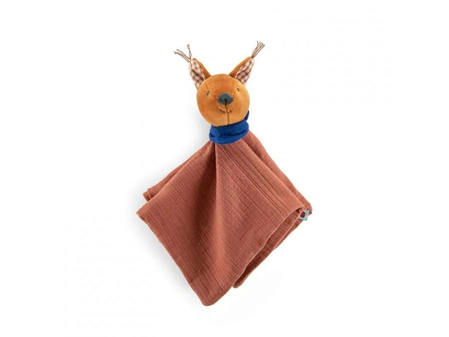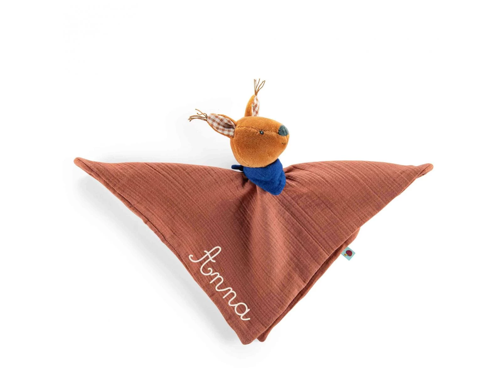 Facile à attraper avec sa tête rembourrée et ses oreilles à mâchouiller, ce doudou écureuil en lange plat, certifié OEKO-TEX®, est un compagnon qui adore les câlins. Le lange s’adoucit à chaque lavage. Peut être brodé au prénom de l’enfant.