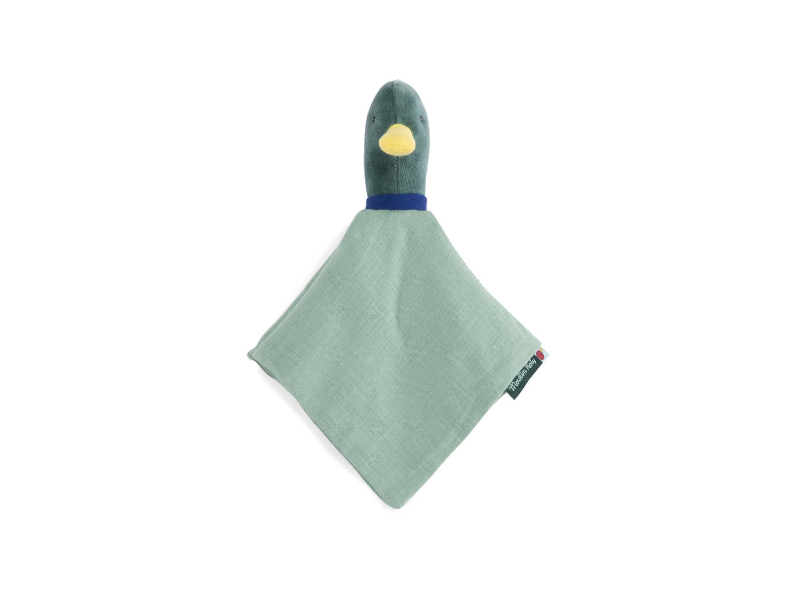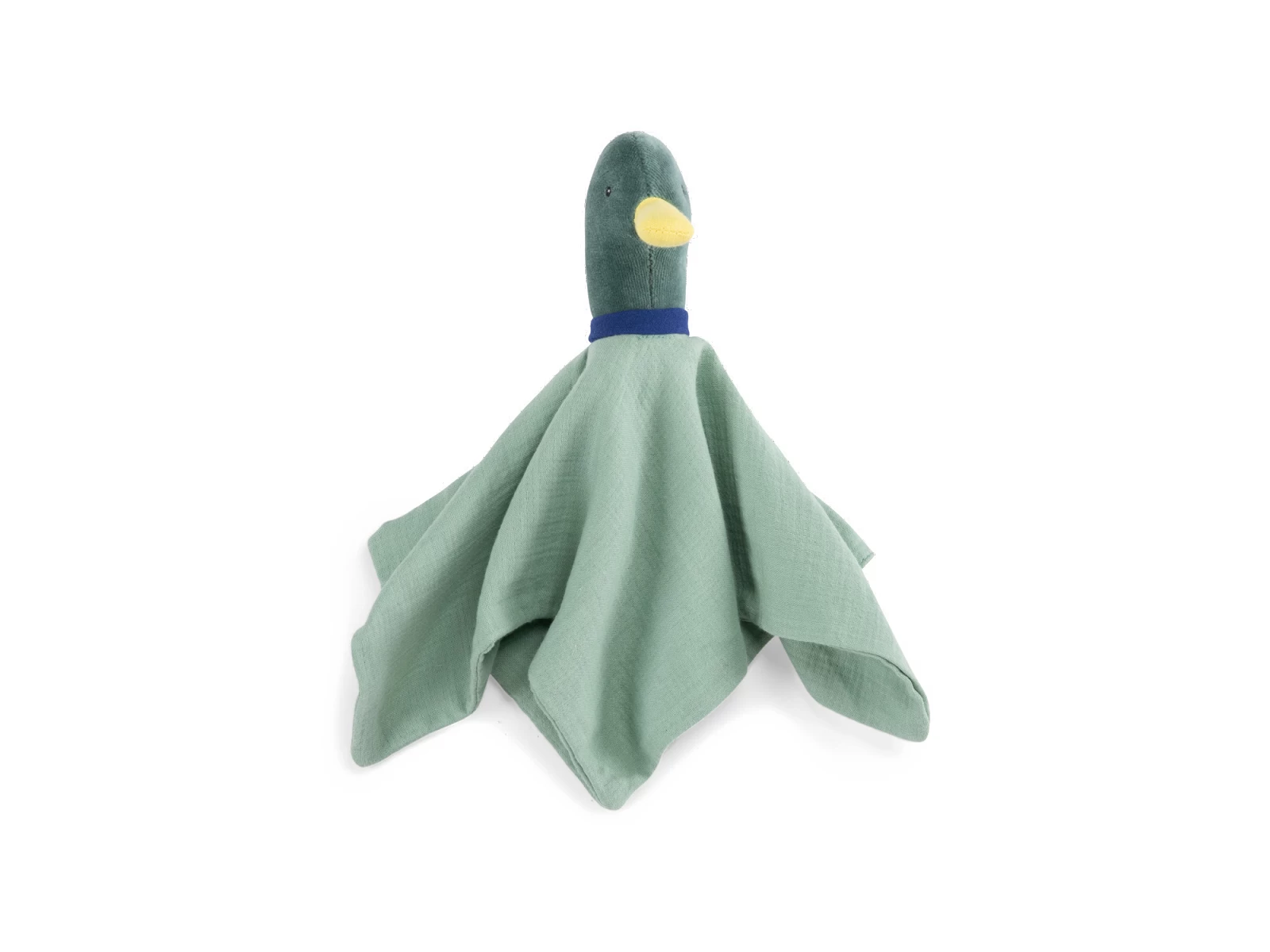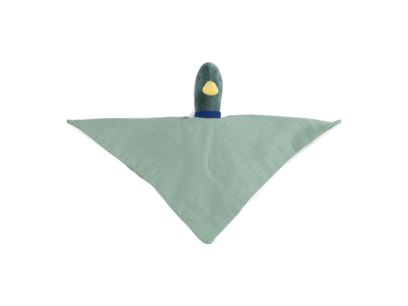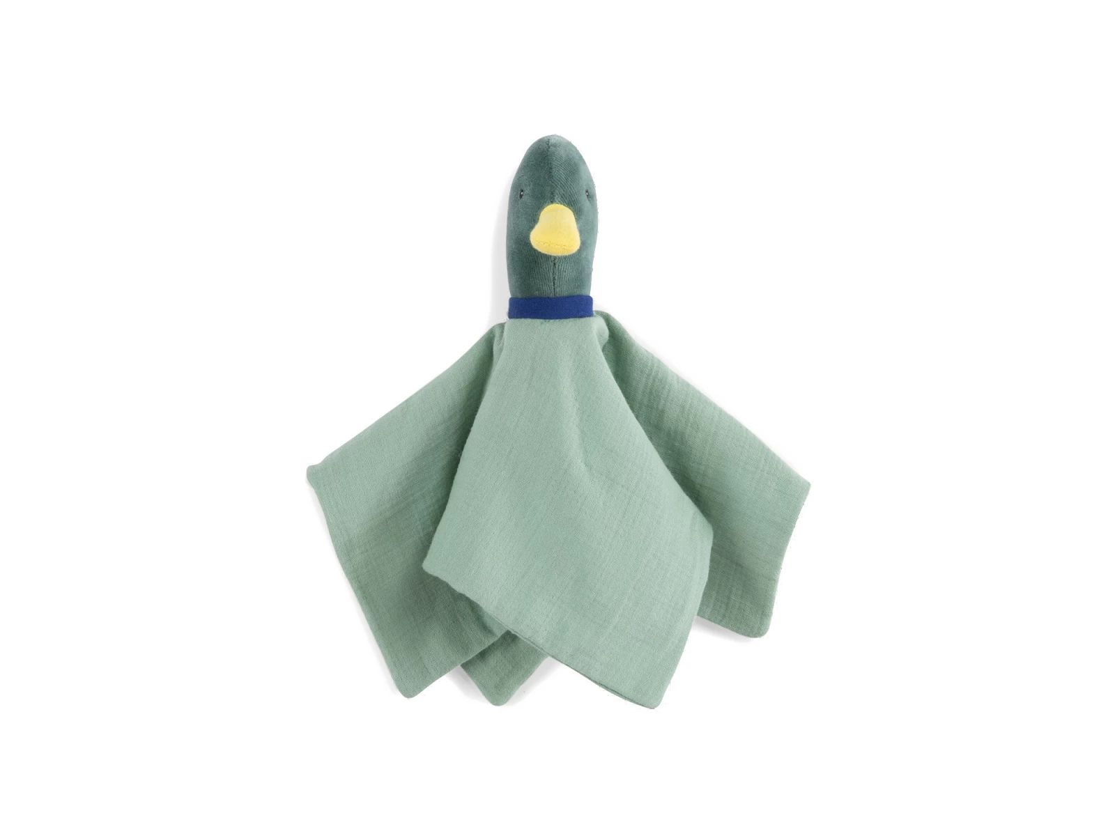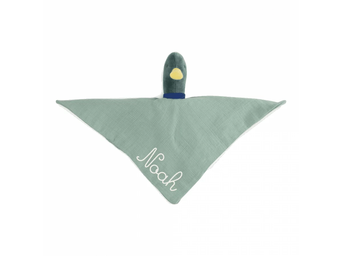 Facile à attraper avec sa tête rembourrée et son bec à mâchouiller, ce doudou canard en lange plat, certifié OEKO-TEX®, est un compagnon qui adore les câlins. Le lange s’adoucit à chaque lavage. Peut être brodé au prénom de lenfant.
